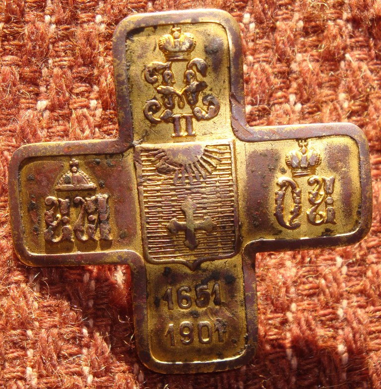 Россия, царский военный полковой Знак 12-го гусарского Ахтырского Ее Императорского Высочества Великой Княгини Ольги Александровны полка для нижних чинов (бронза, позолота). 15 апреля 1909 в память о 250-летии полка был утвержден полковой знак 12-го гусарского Ахтырского полка, который имел форму четырёхконечного креста. На концах креста накладные вензеля: на левом — царя Алексея Михайловича, на правом — шефа полка Великой Княгини Ольги Александровны, на верхнем — императора Николая II, на нижней лопасти — накладные юбилейные даты: «1651» и «1901». В центре креста герб г. Ахтырки (на щите, залитом голубой эмалью, золотой четырёхконечный крест, а над ним золотое сияние солнца).