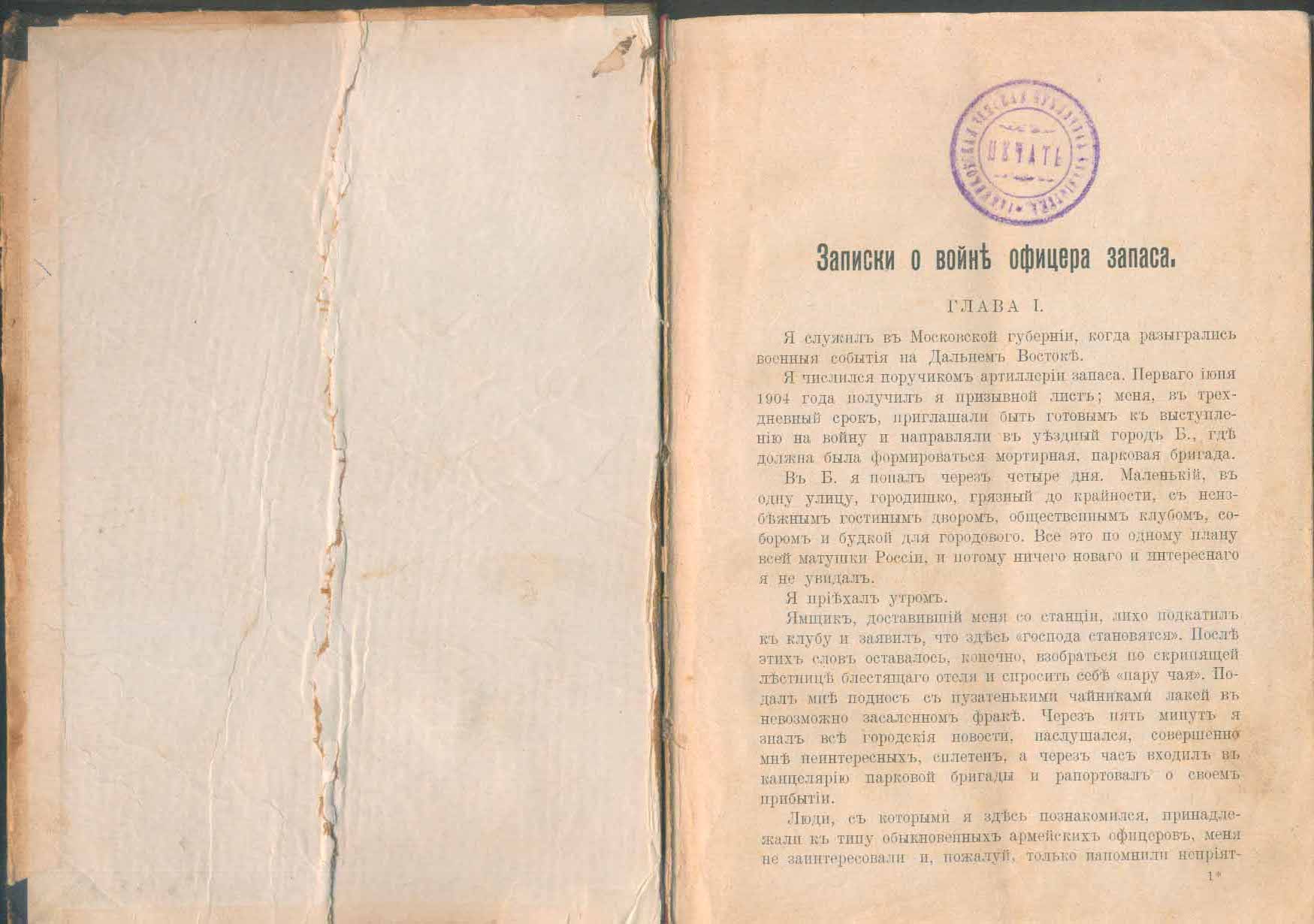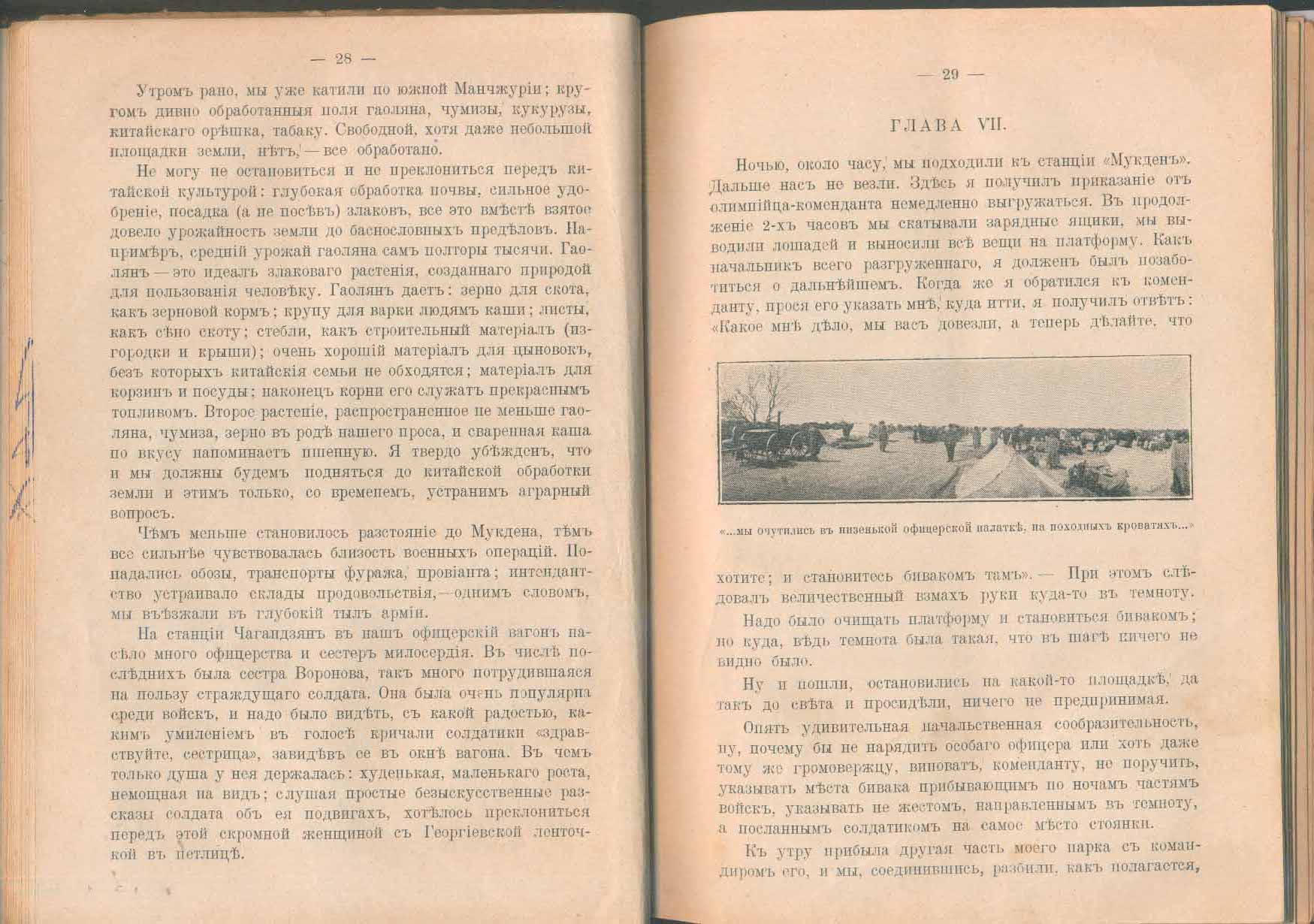 Июнь 1904 - осень 1905. Мобилизация на войну и зачисление в парковую бригаду. Природа Северной Маньчжурии. Город Мукден. Бивачная жизнь. Русское и японское зимнее обмундирование. Русские позиции у Путиловской сопки. Деятельность интендантской службы. Китайские шпионы. Командировка в Харбин. Взаимоотношения с китайским населением. Бой у деревни Сандепу 12(25) янв. 1905 г. Отступление с боями к Мукдену. Расквартирование войск на зиму. Революционные настроения в Харбине осенью 1905 г. Устройство вечера в Харбине в пользу голодающих крестьян. Поездка во Владивосток. Перевозка войск в Россию.