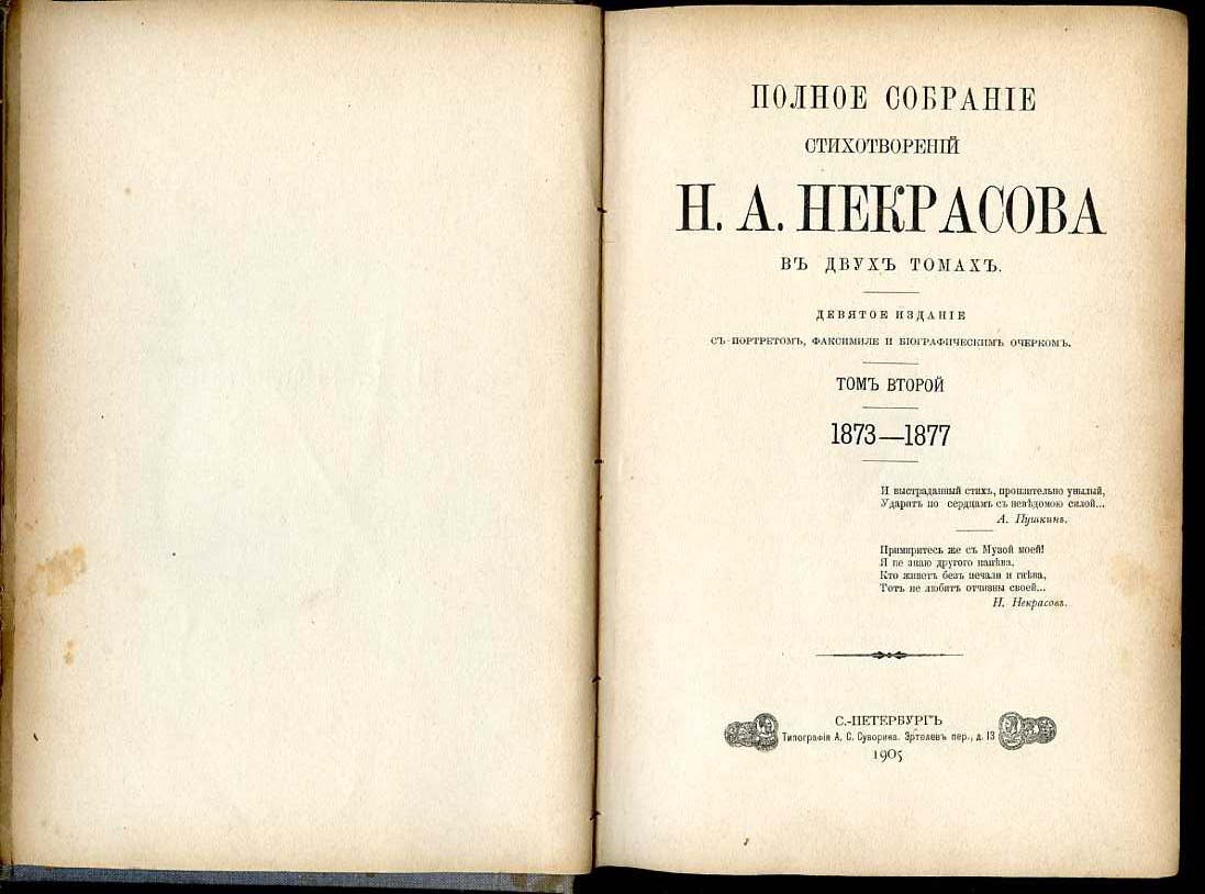 Некрасов Н.А. Полное Собрание Стихотворений в двух томах. Два тома С.- Петербург. Типография А.С. Суворина. 1905 г. 608 с., + 566 с. Девятое издание с портретом, факсимиле и биографическим очерком. Портрет печатан со стали Ф.А. Брокгауза в Лейпциге. Твердый переплет с фотографией Некрасова, Размер 22х15 см.