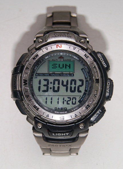 Компас, высотомер, термометр,барометр, автоматическая подсветка, куча будильников, двойная застежка на браслете и т.д. Все отлично работает. корпус и браслет из титана.