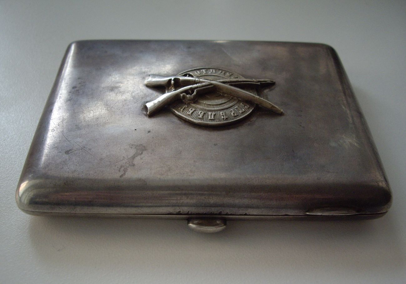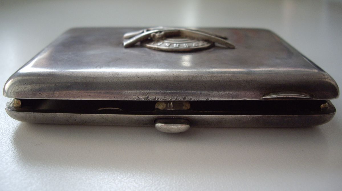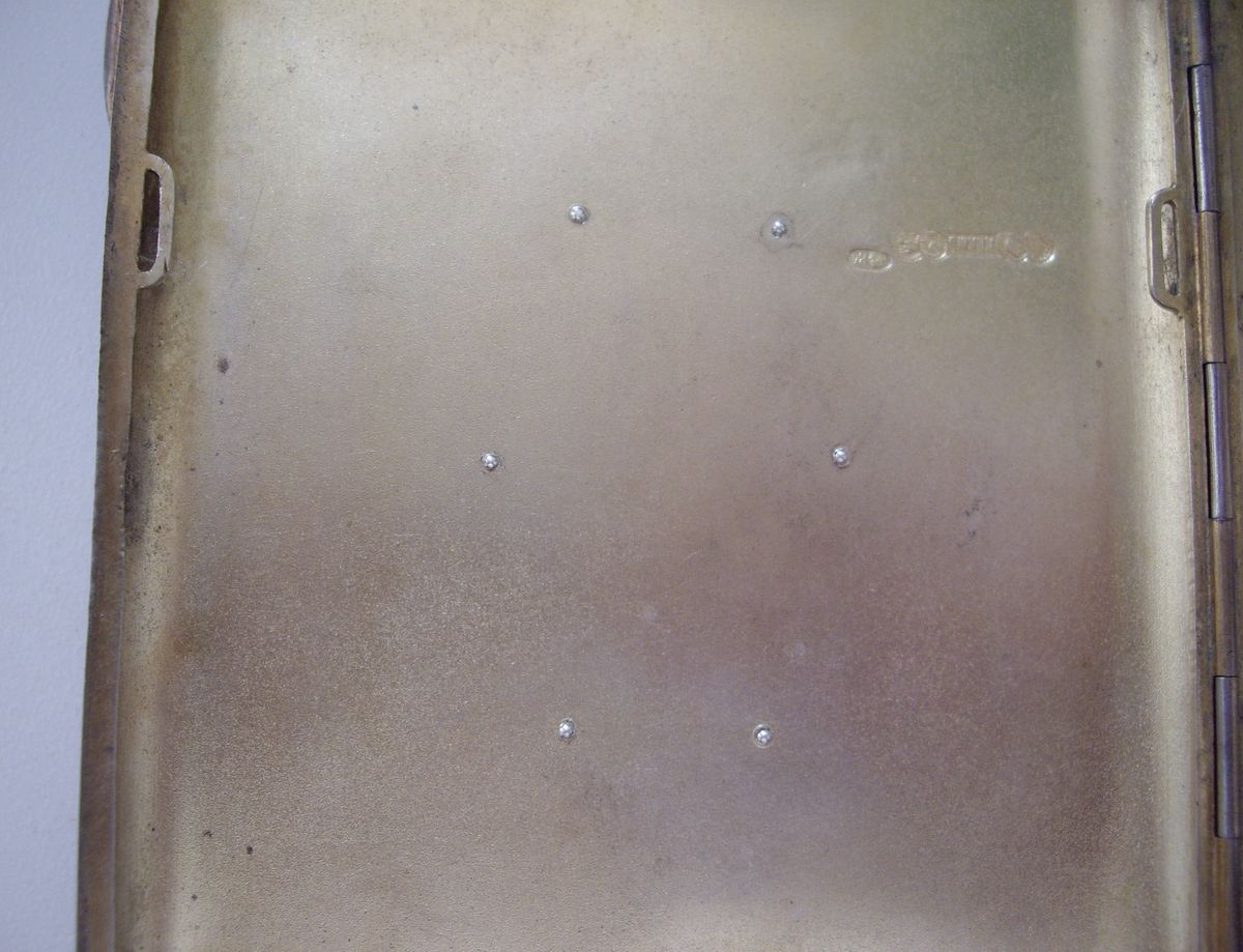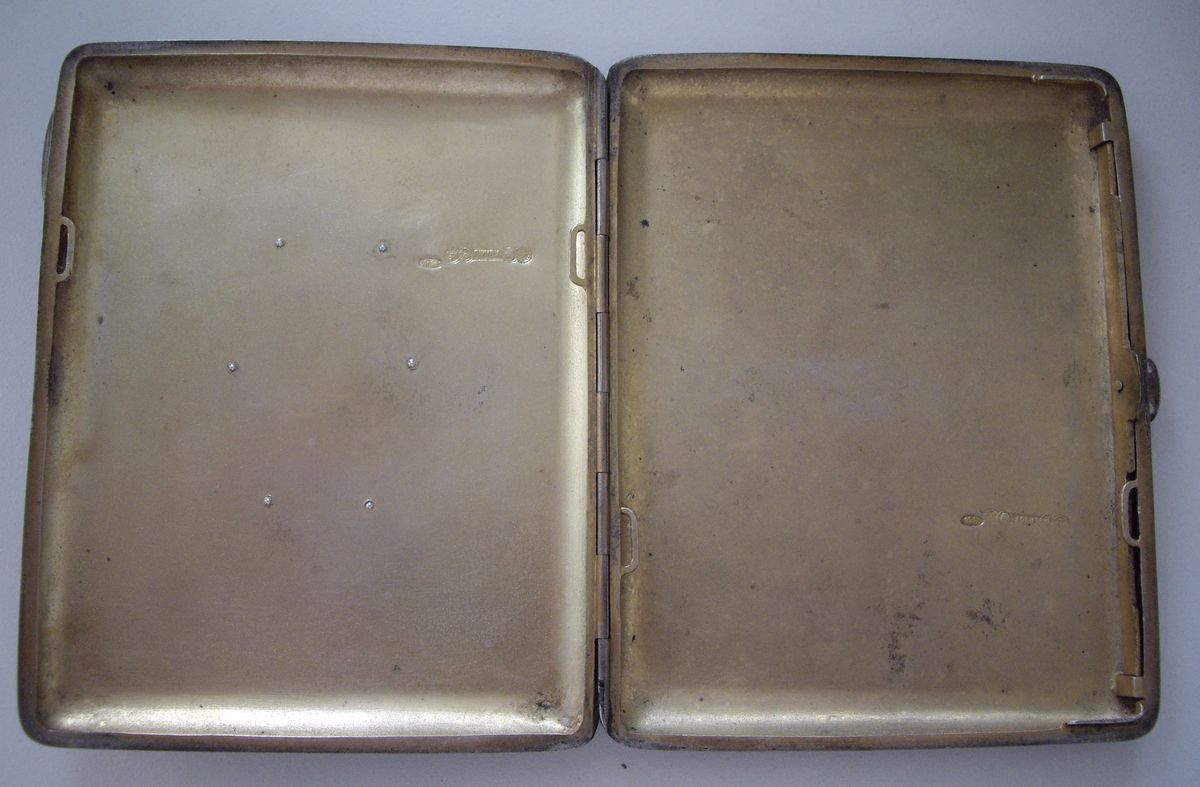 КЛЕЙМО "АОАМЗ" - акционерн. общ-во артелей московских золотых дел мастеров. нач. ХХ в. ( если не так, поправьте ) р-р 117 х 93 мм, ВЕС = 226 гр., ВНУТРИ ПОРТСИГАРА ПОЗОЛОТА ( на фото не заметно ). ВЕНЗЕЛЬ на 6 заклёпках, явных вмятин по бокам - НЕТ. следы ношения - есть ( иначе не может быть ). НА КОМИССИИ, дорого, рассмотрим предложения, обсудим, вдруг вещь рядовая ???