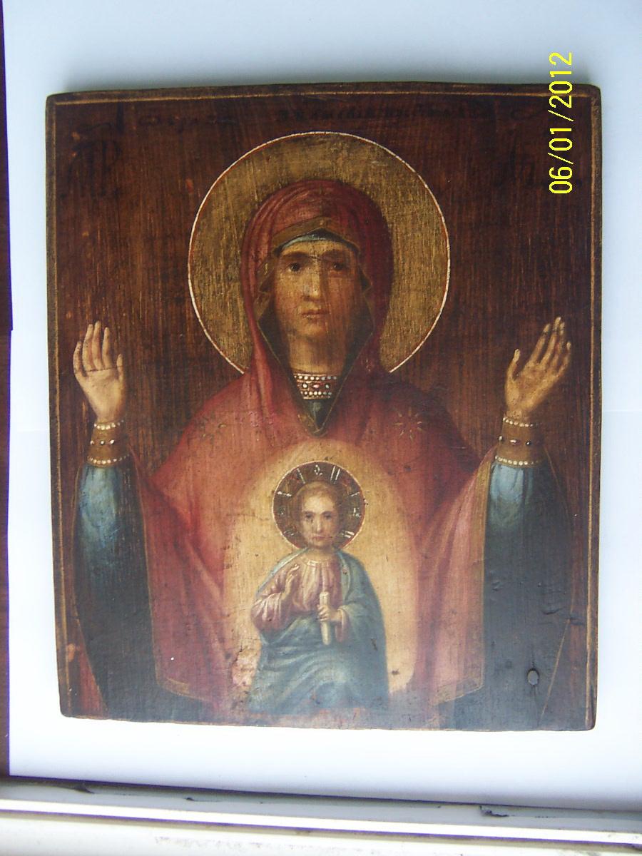 Предлагаю икону "Богородица Знамение",в очень хорошей сохранности,без реставрации,размер 28см на 23,5см,толщина 2см.