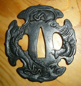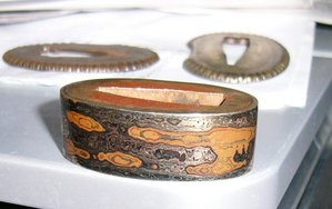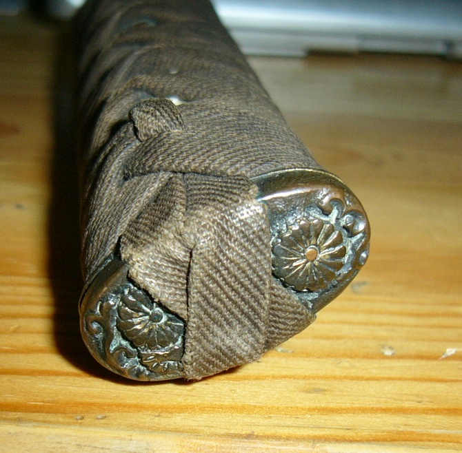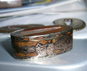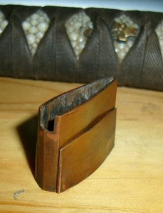 Прибор видимо сборный -верхняя втулка по стилю Мокумэ-ганэ-практически ювелирное изделие ( золото,серебро ,медь...) по стилю с остальным не сочетается как и цуба в целом. Отверстие в ручке не совпадает с отверстием в клинке ( сейчас на тугую посадку сидит). Но все это настоящее нихонто. Оправа наверно начало 19. Хабаки сборную из двух частей использовали на боевых мечах где сильные нагрузки были.