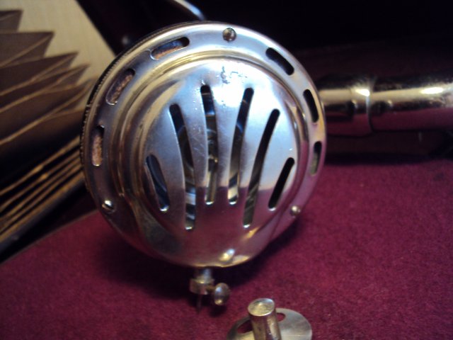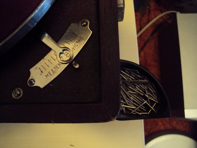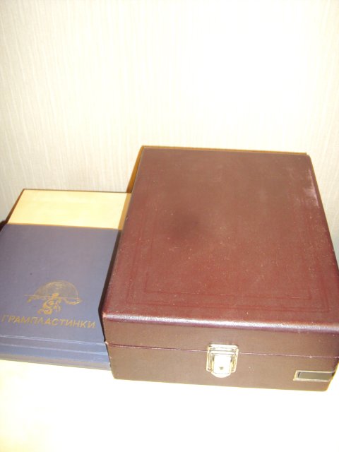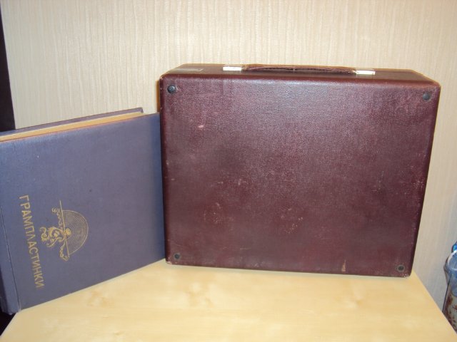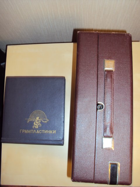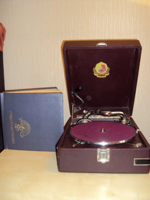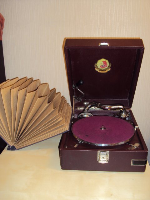 уменьшенный патефон, состояние идеальное, звучание четкое и громкое. корпус целый без наружный дефектов. к патефону прилагается альбом в виде веера на 20 пластинок. в альбоме 20 конвертов, в наличии 6 средних размеров пластинок.