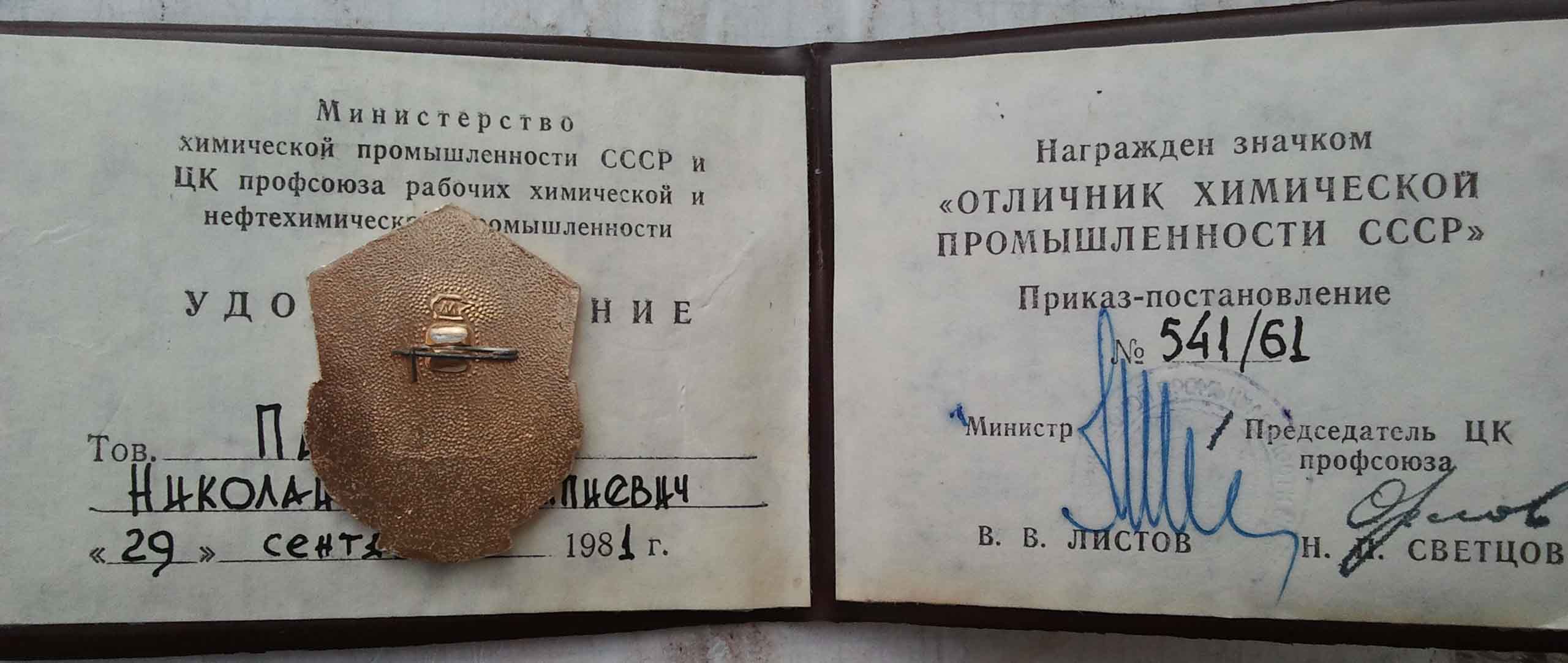 Отличник химической промышленности СССР с документом