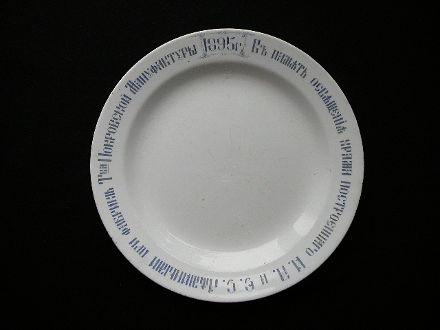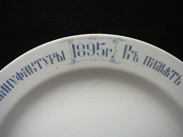 Тарелка "В память освящения храма построенного И. А. и Е. С. Лямиными при фабрике Т-ва Покровской Мануфактуры, 1895 год". Кузнецов, фаянс, деколь. Диаметр - 23 см. Состояние отличное, без сколов и трещин.