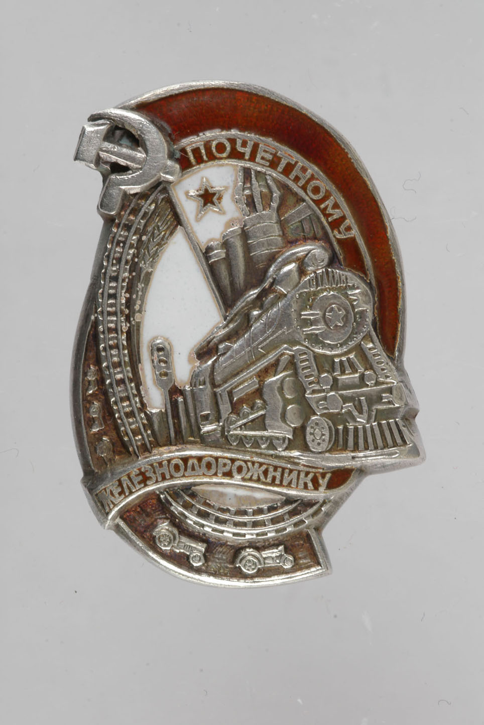 Есть вот такой знак почётного ж/д в серебре без номера. Знак контр-рельеф (в каталогах не нашёл) и со звездой на котле. Красная эмаль имеет кирпичный оттенок и слово "почётному" в красной эмали тоже.
