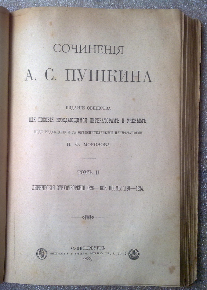 Пушкин А.С. Сочинения. Издание общества для пособия нуждающимся литераторам и ученым, под редакцией и с объяснительными примечаниями П.О.Морозова. 7 томов. В трех кожаных издательских переплетах того времени. Иллюстрированное издание.