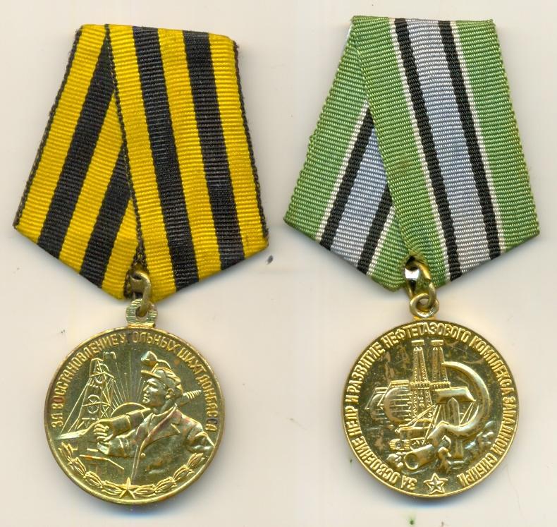 Медали Серп и Молот, За Трудовую Доблесть, За Трудовое Отличие, За Доблестный Труд в Великой Отечественной Войне,За Восстановление Предприятий Чёрной Металлургии Юга, За Восстановление Угольных Шахт Донбасса, За Освоение Целинных Земель, За Строительство БАМ, За Преобразование Нечерноземья РСФСР, За Освоение Недр и Развитие Нефтегазового Комплекса Западной Сибири, Ветеран Труда