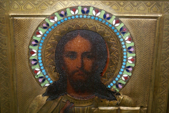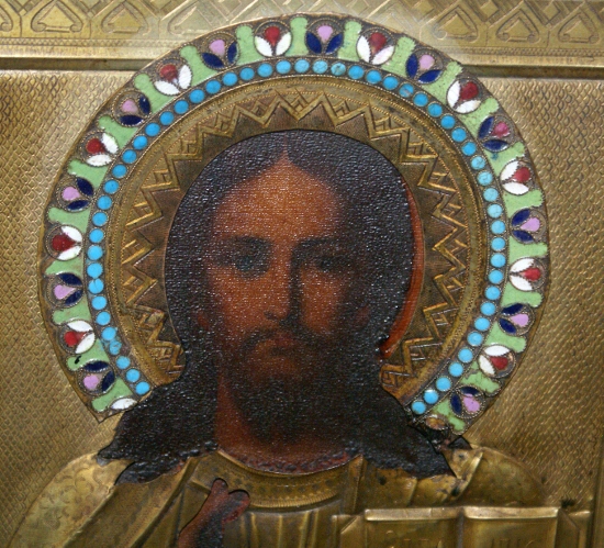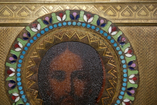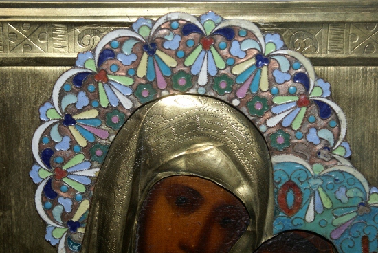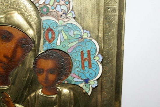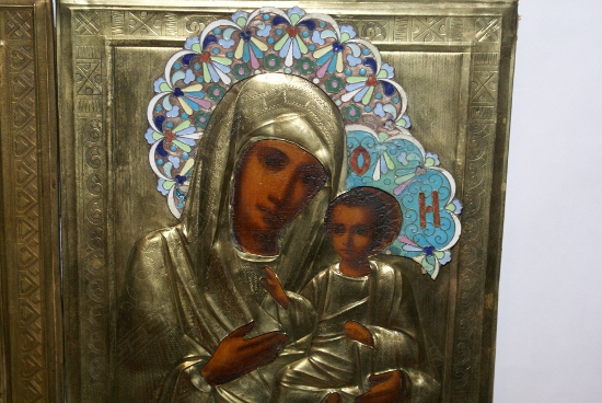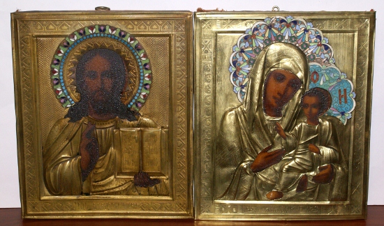 Иконы с латунными окладами, венцы с эмалями.