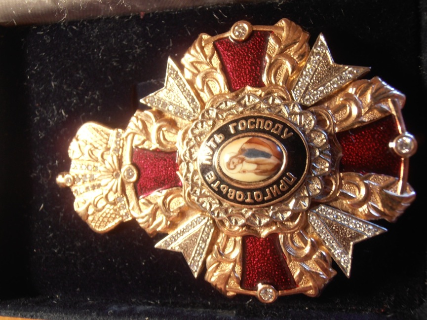 Орден российско-сербского Фонда "Десницы Иоанна Крестителя". Золото 585 пробы, эмаль, бриллианты. Общий вес 31, 55 грамма. Клейма: голова в крылатом шлеме и 585. Второе: ДВНЛ. Всего изготовлено в золоте три экземпляра. Один находится у Митрополита Черногорского, хранителя Десницы Иоанна Крестителя. Вторым награжден Святейший Патриарх Грузии Илия Второй. На продажу выставлен первый пилотный образец. При заинтересованности клиента вышлю документы по статуту Ордена и наградную грамоту. Остальные ордена были отчеканены из орденского сплава и латуни. Предложите.