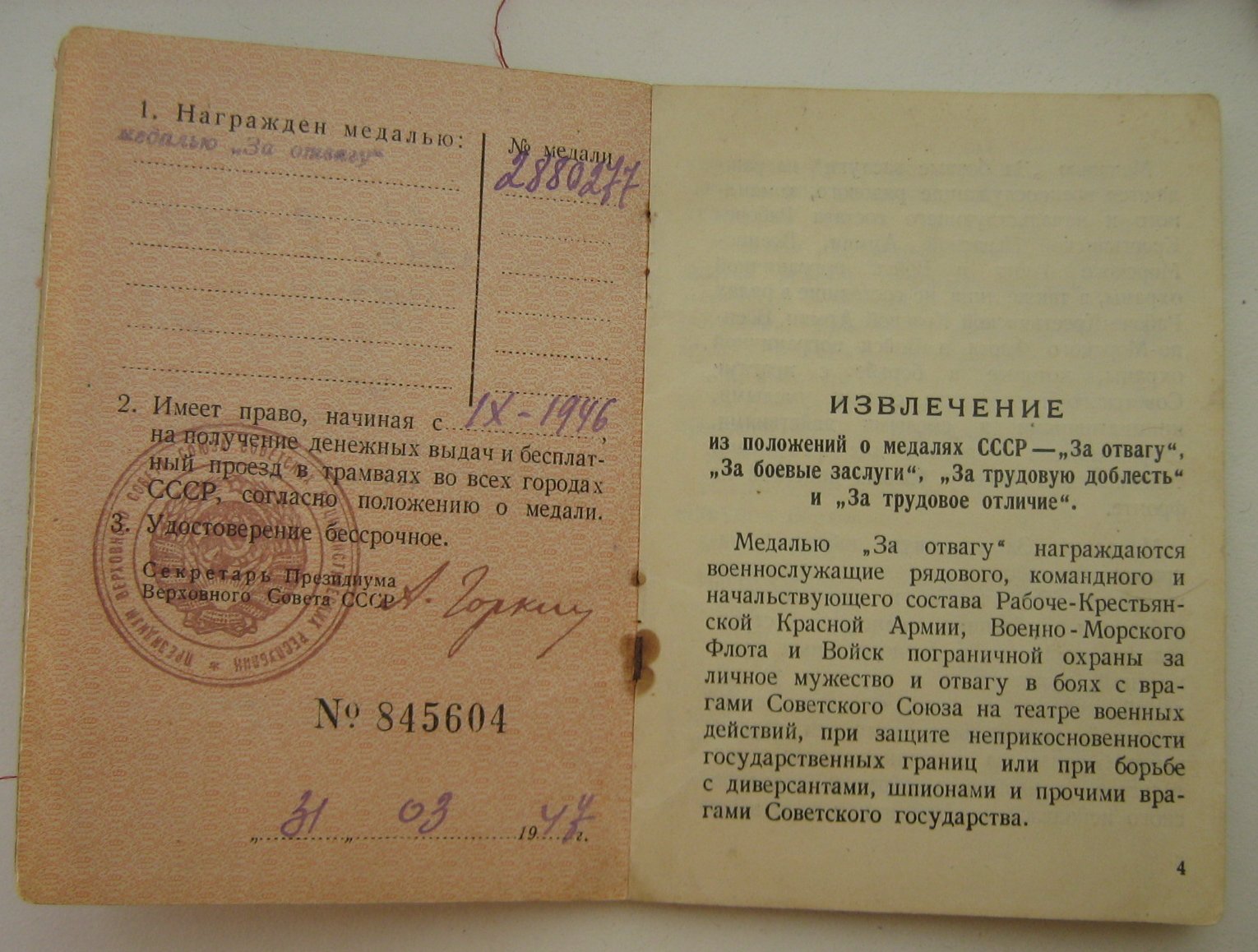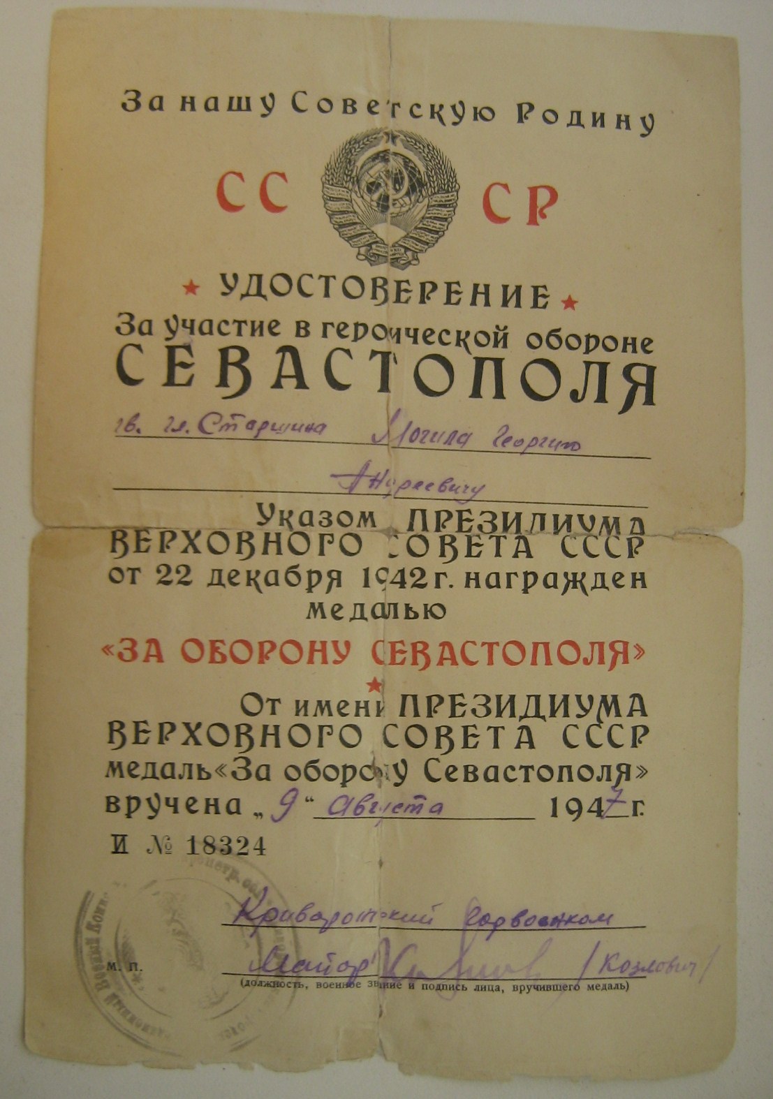 Севастополь в крайне удовлетворительном состоянии :порван по сгибуна три сегмента и подклеен прозрачным скотчем ( см. фото), док на отвагу - хороший. Медали утеряны.