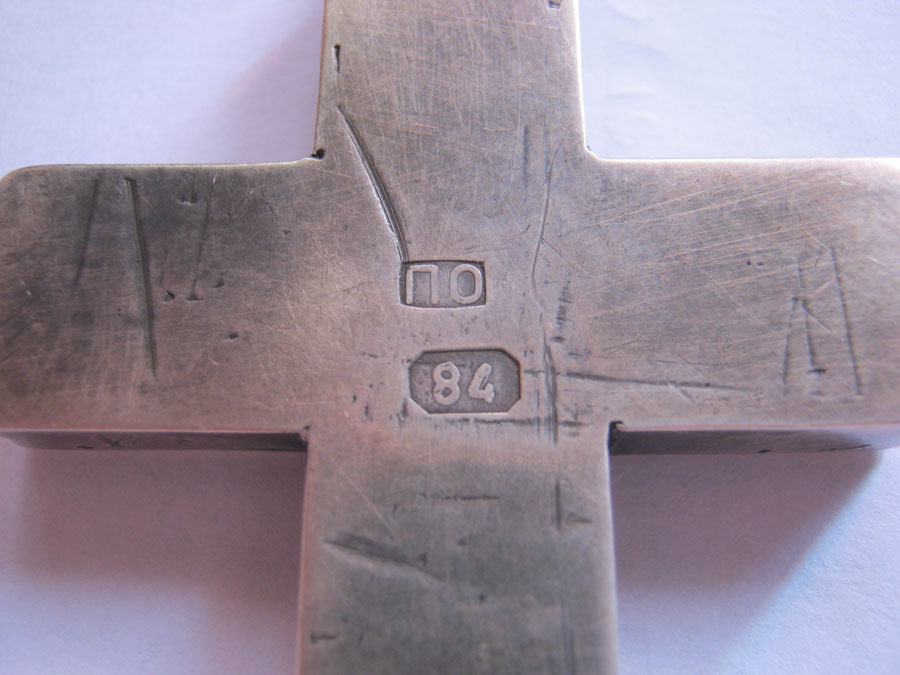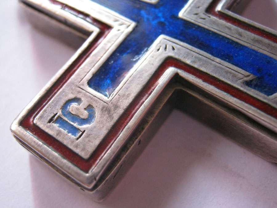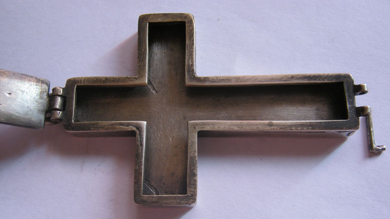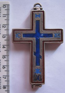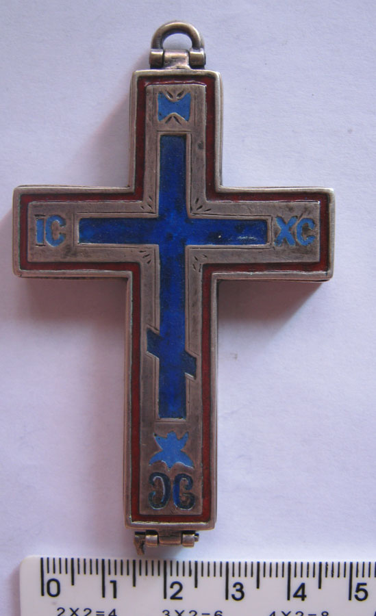 Крест очень похож на крест с частицей Животворящего Древа (Иерусалимский) ( похож по форме... http://palomnic.org/journal/6/8/1/ ) . Но я могу ошибаться..