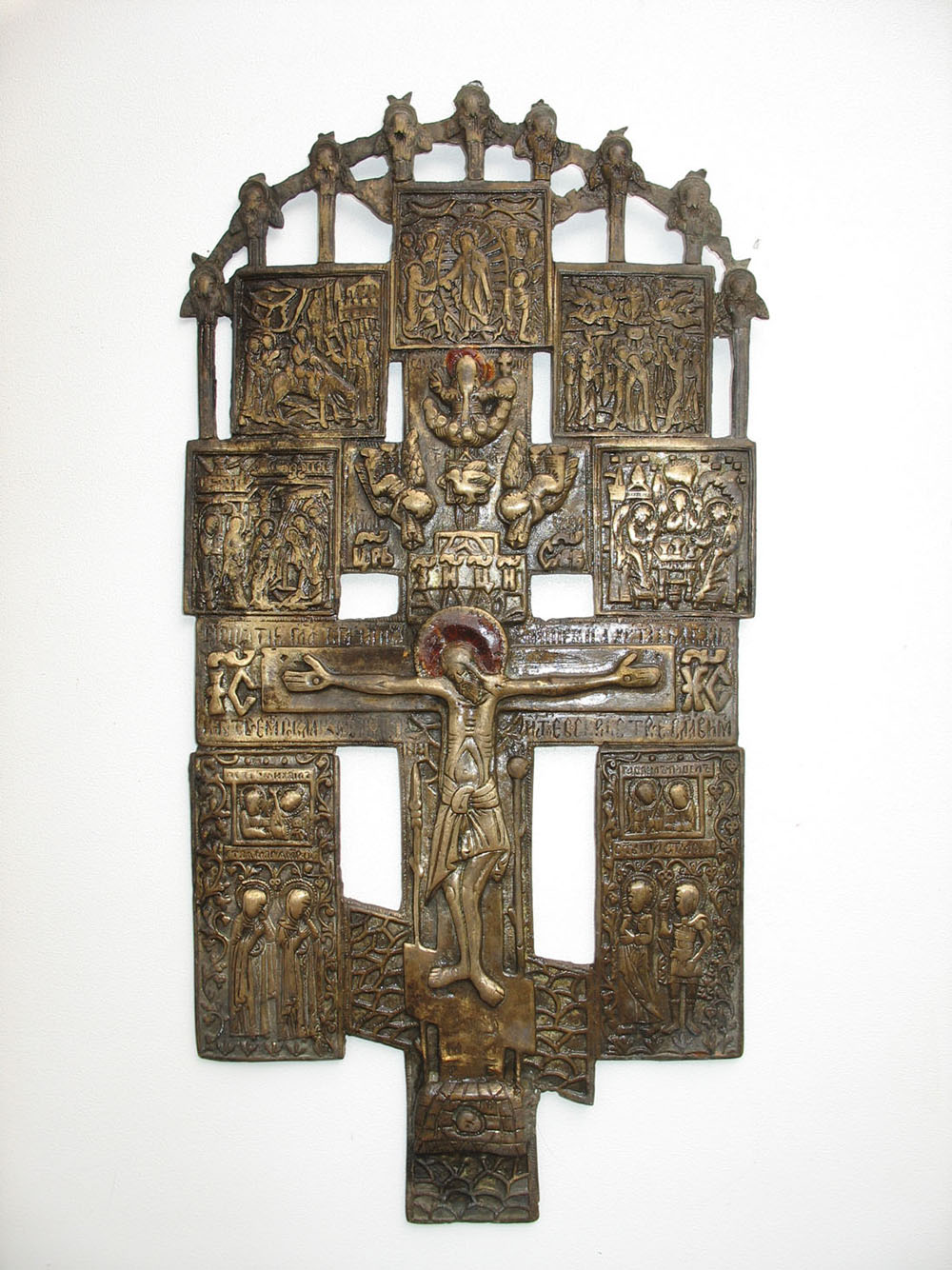 На кресте ,над распятием ,-на эмаль не похоже,но работа старая...