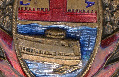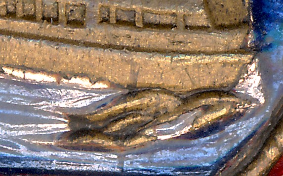 Под носом корабля металл возвышающийся над уровнем эмали и продолжающий линию надстроек корабля. Там видимо эмали быть не должно, но есть тонкий слой, как и на волнах перед носом. Он и блестит.
