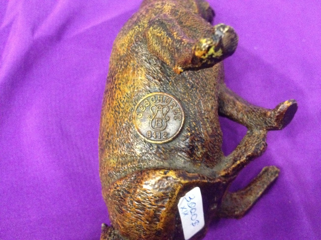 Клеймо "Литера "В" в кувшине" ставилось на изделия, отлитые на фабрике Бергмана. "Geschutzt" - "зарегистрировано" или "авторское право", особая отметка на старых предметах "венской бронзы".Венская бронза как новый вид изделий австрийской художественной промышленности ведет свою историю с середины XIX века. Раскрашенные латунные скульптурки зверей, людей, растений и даже бабочек, жуков, мушек или кузнечиков — все эти сувенирного характера предметы, из которых можно было составить очень потешные жанровые сценки, являлись во второй половине XIX века актуальными предметами для украшения домашнего быта. читать статью...