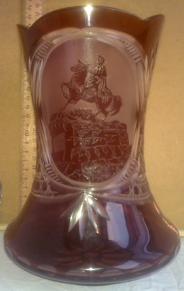 Из марганцевого стекла,глубокое травление (ручная работа),алмазная грань. Ваза изготовлена в 1953 году на Киевском заводе художественного стекла в канун празднования 300-летия воссоединения Украины с Россией и демонстрировалась на ВДНХ в Москве.