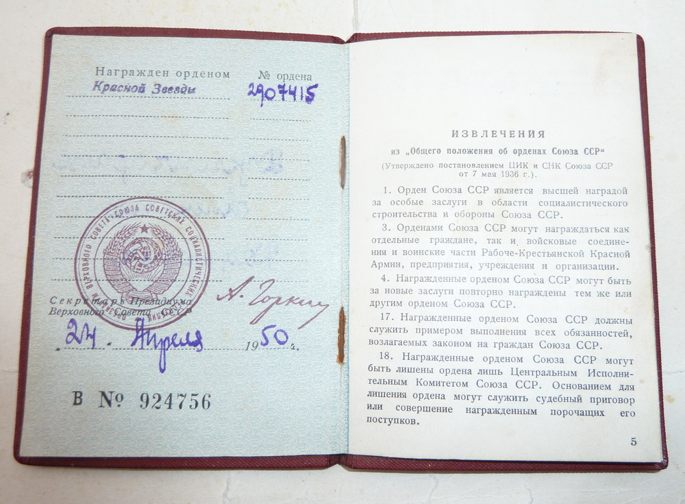 Красного Знамени, Суворова, Кутузова, Богдана Хмельницкого, Александра Невского, Ушакова, Нахимова, Отечественной Войны, Красной Звезды, Славы, За Службу Родине в ВС СССР