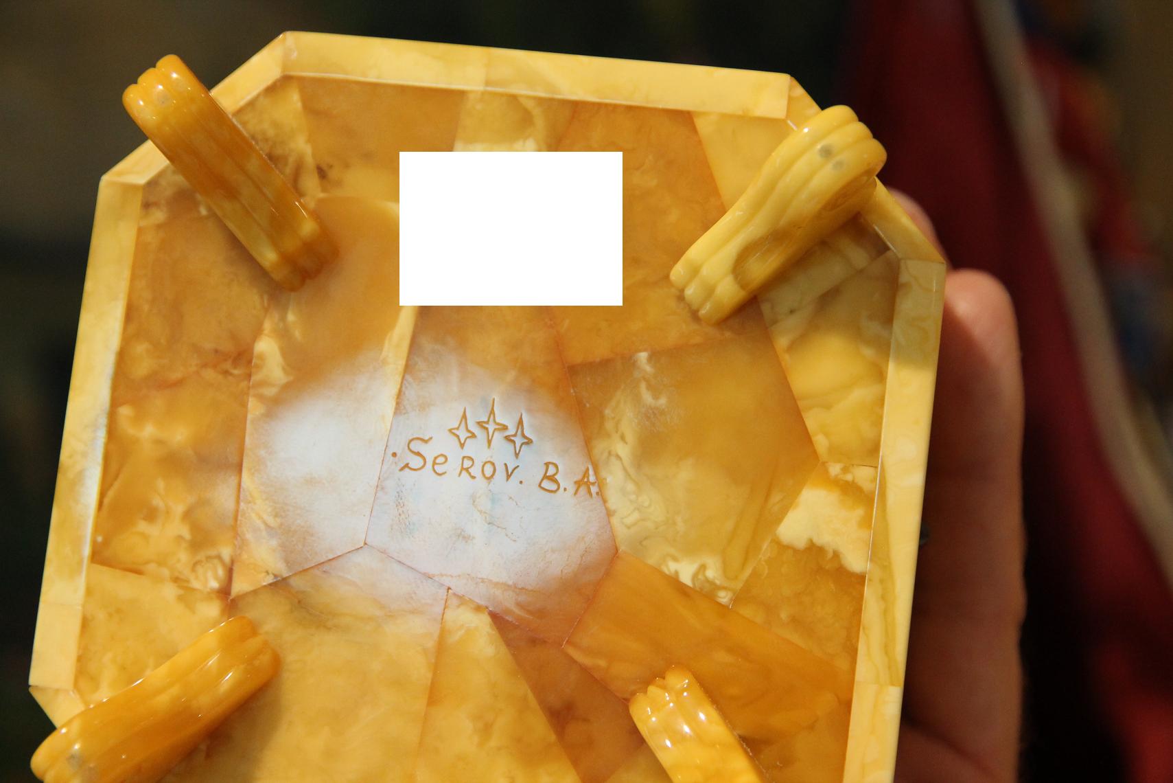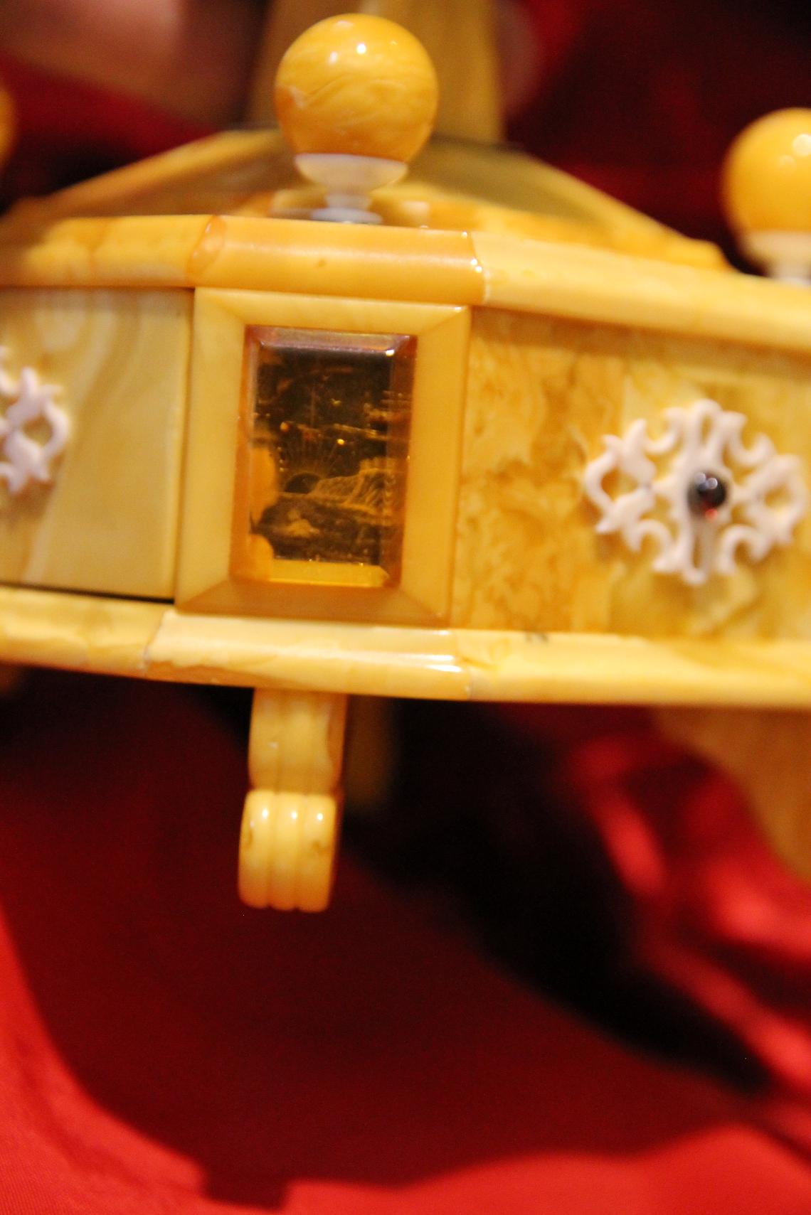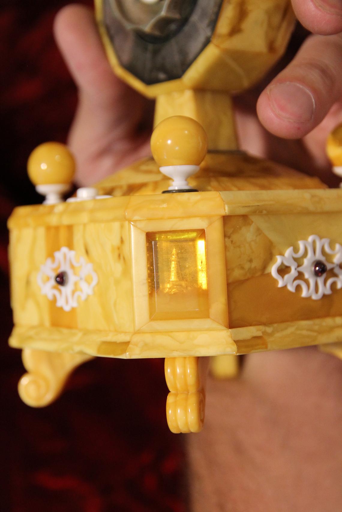 На всех 4 углах - накладки из прозрачного янтаря - под которыми находятся изображения маяка, парусника, моря и т.д. Изображения выполнены гравировкой по янтарю