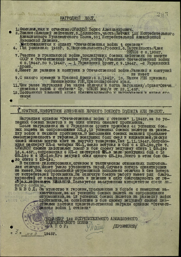 Кавалер - Сумской Борис Александрович (летчик - истребитель).