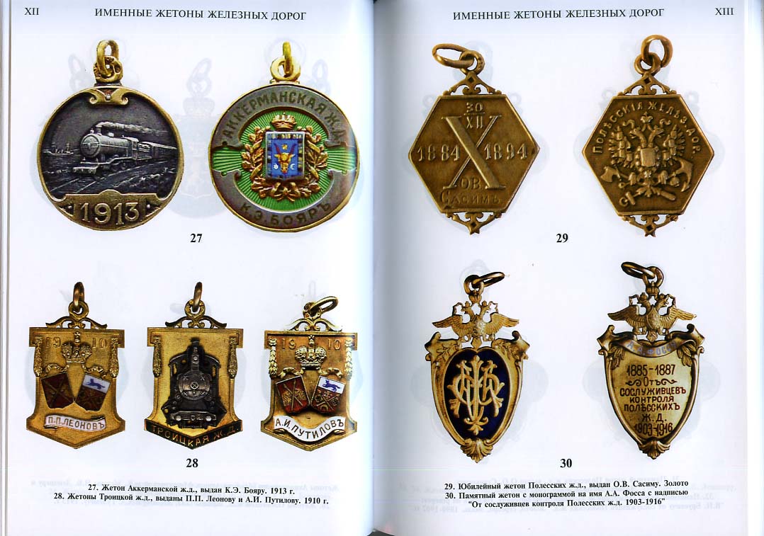 Описаны и изображены относительно редкие знаки об окончании учебных заведений, награды за долголетний труд на железных дорогах и памятные жетоны отдельных дорог. Эти образцы также изготовлены из драгметаллов и расписаны эмалями. Наконец, третья группа, самая массовая, - служебные жетоны, характеризовавшие должностное положение провод¬ников, кочегаров и т.п. низших категорий железнодорожных служащих. Эти жетоны изго¬товлены из меди, латуни. Читатели и коллекционеры отнесут к несомненным достоинствам книги также прекрасные цветные фотографии перечисленных объектов фалеристики.