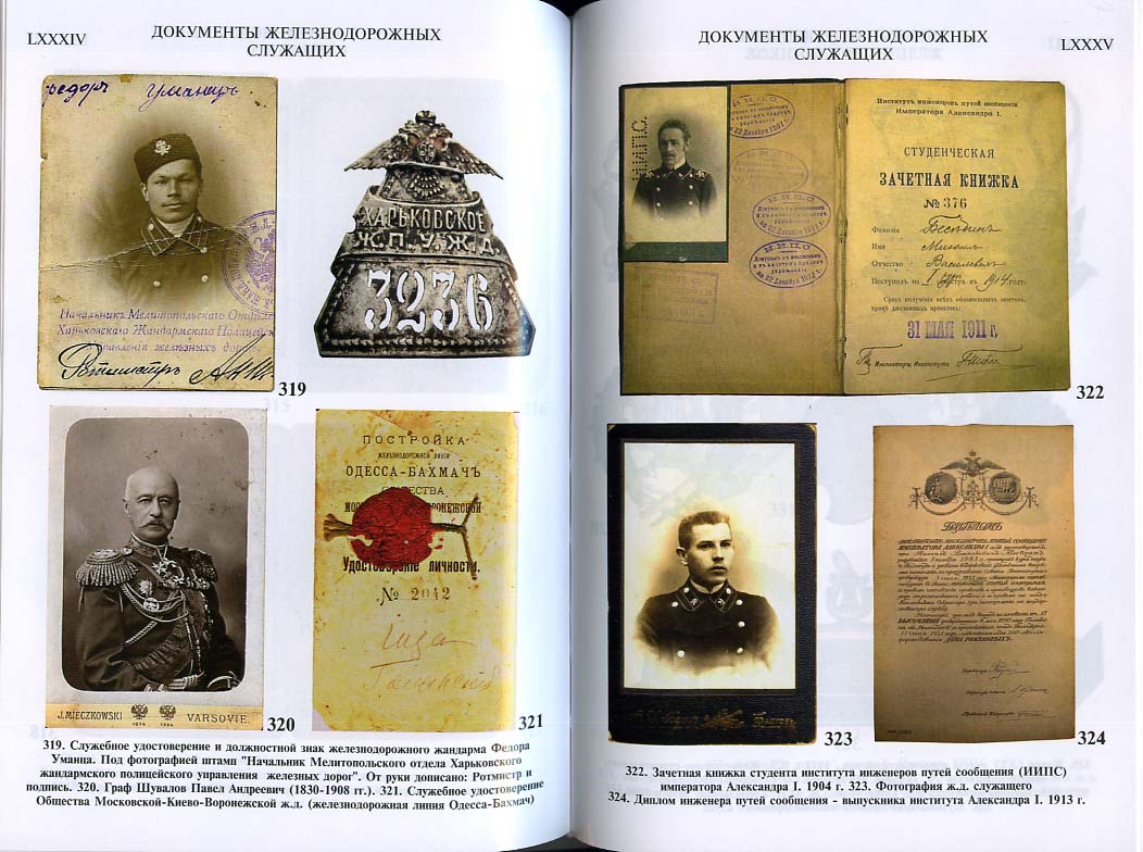 В.П. Лапин представил множество документов, относящихся к рассматриваемому перио¬ду - в книге приводятся фотографии служащих, фотокопии приказов, рапортов, служебных отношений, удостоверений и т.п.. Среди других объектов - настольные медали, отчеканенные в память о событиях, связанных с железнодорожным транспортом; формы одежды и знаки различия железнодорожников с 1834 по 1917 гг. Книга содержит более 50 фотографий пря¬жек на ремни железнодорожников, более 30 фотографий форменных пуговиц и более 10 фо¬тографий кокард и эмблем. Наконец, более 20 фотографий представляют боны Русско-Азиа¬тского банка для Китайской Восточной железной дороги и облигации различных обществ же¬лезных дорог Российской империи. Всего в книге свыше 1000 фотографий и рисунков.