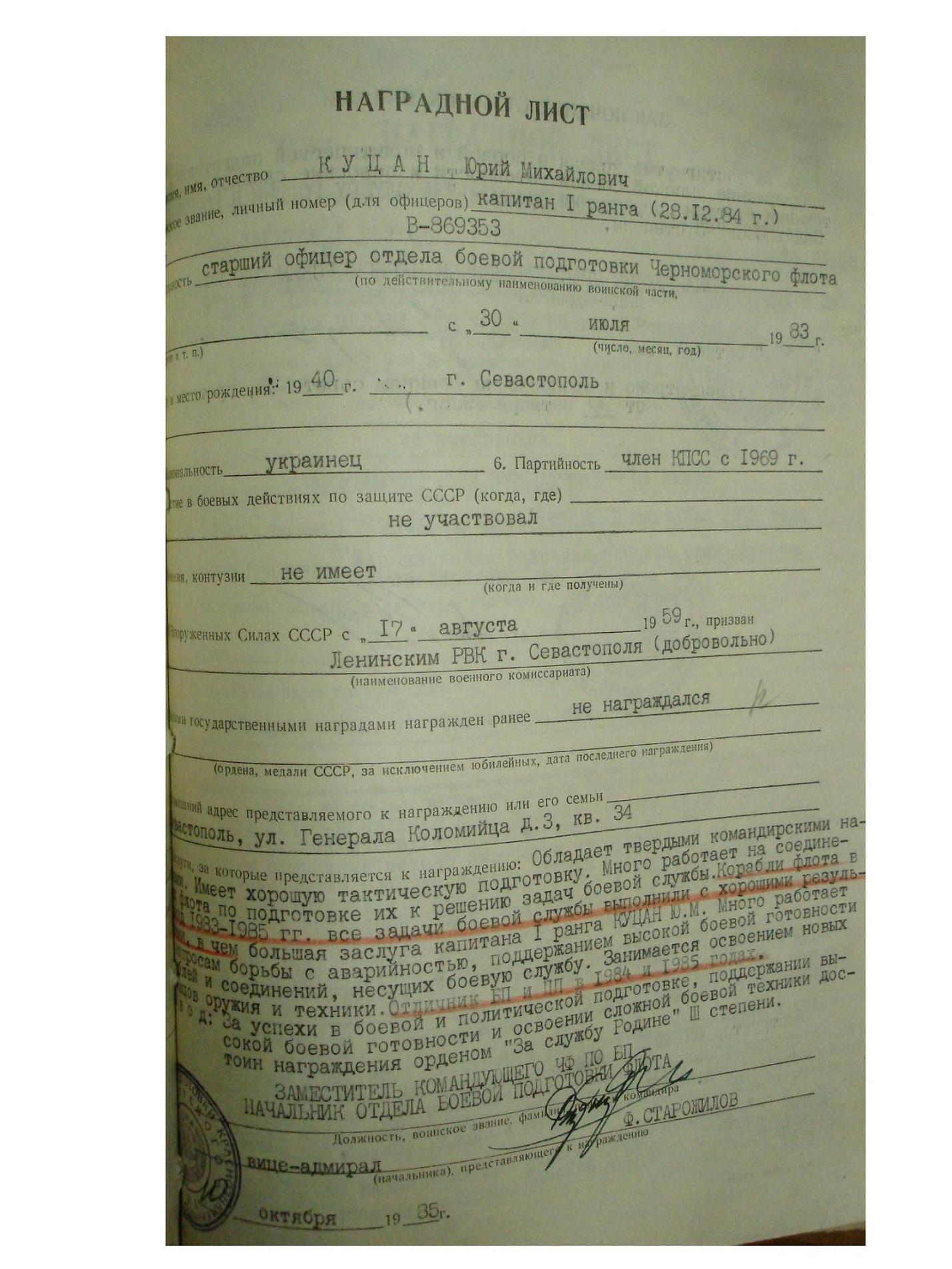 Красного Знамени, Суворова, Кутузова, Богдана Хмельницкого, Александра Невского, Ушакова, Нахимова, Отечественной Войны, Красной Звезды, Славы, За Службу Родине в ВС СССР