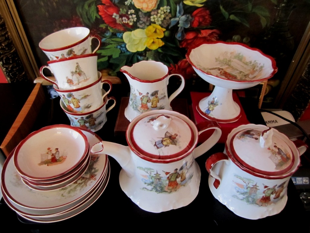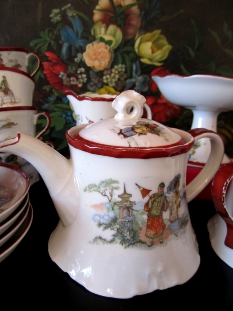 Такой вот красивый сервиз на четыре персоны. В комплекте 16 предметов: Чайник,сахарница,сливочник,конфетница,четыре блюдца+четыре малых блюдца,четыре чашки.