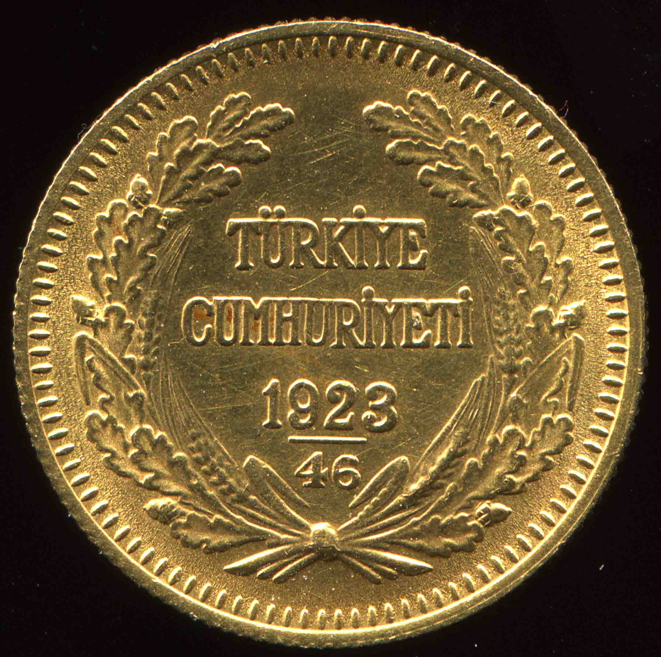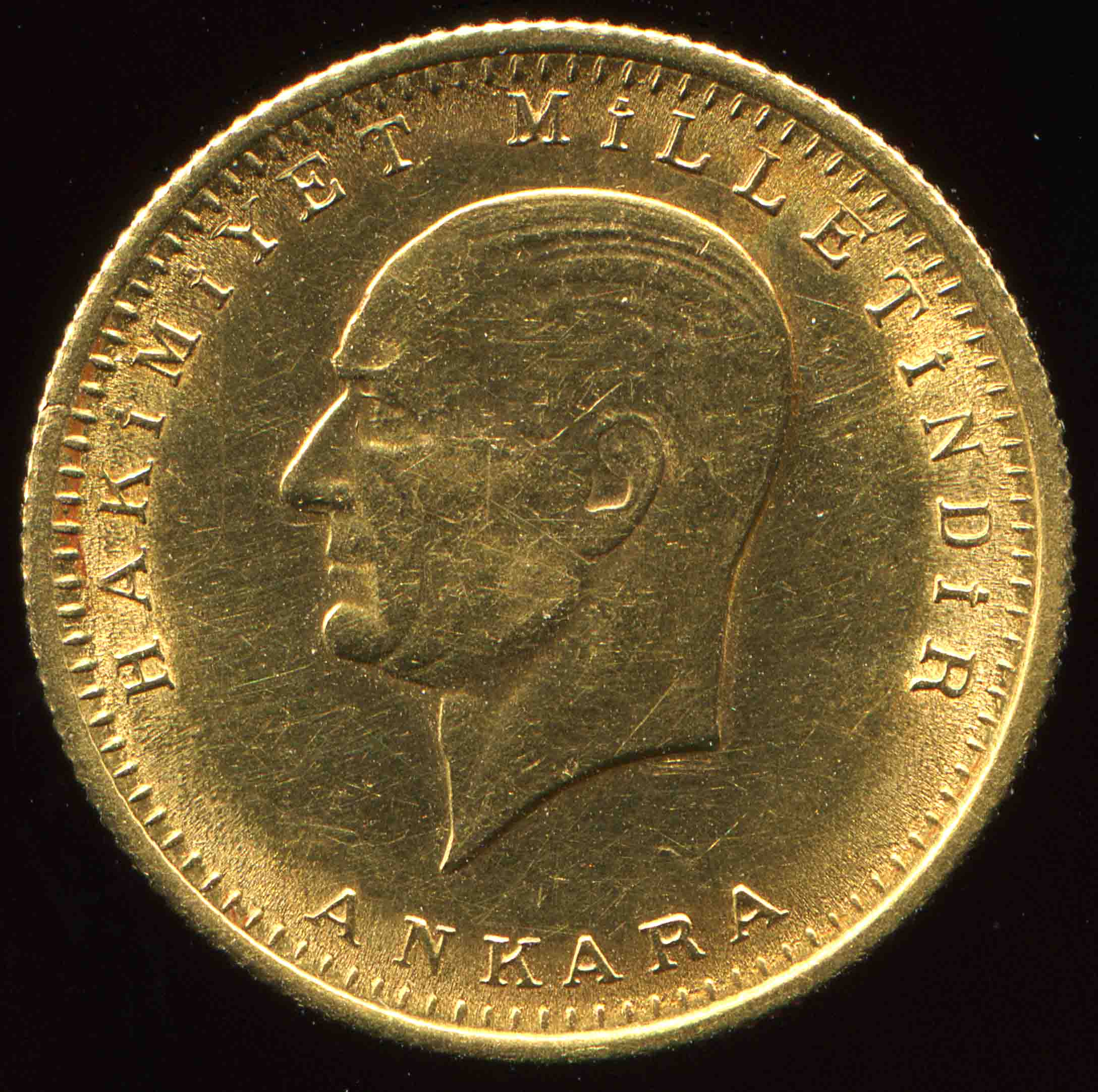 Золотая монета Турции, с изображением Мустафы Кемаля Ататюрка - турецкий политик, первый президент Турецкой Республики. Вес: 7.22 грамма, Номинал: 100 куруш, Металл: Золото, Проба: .917,