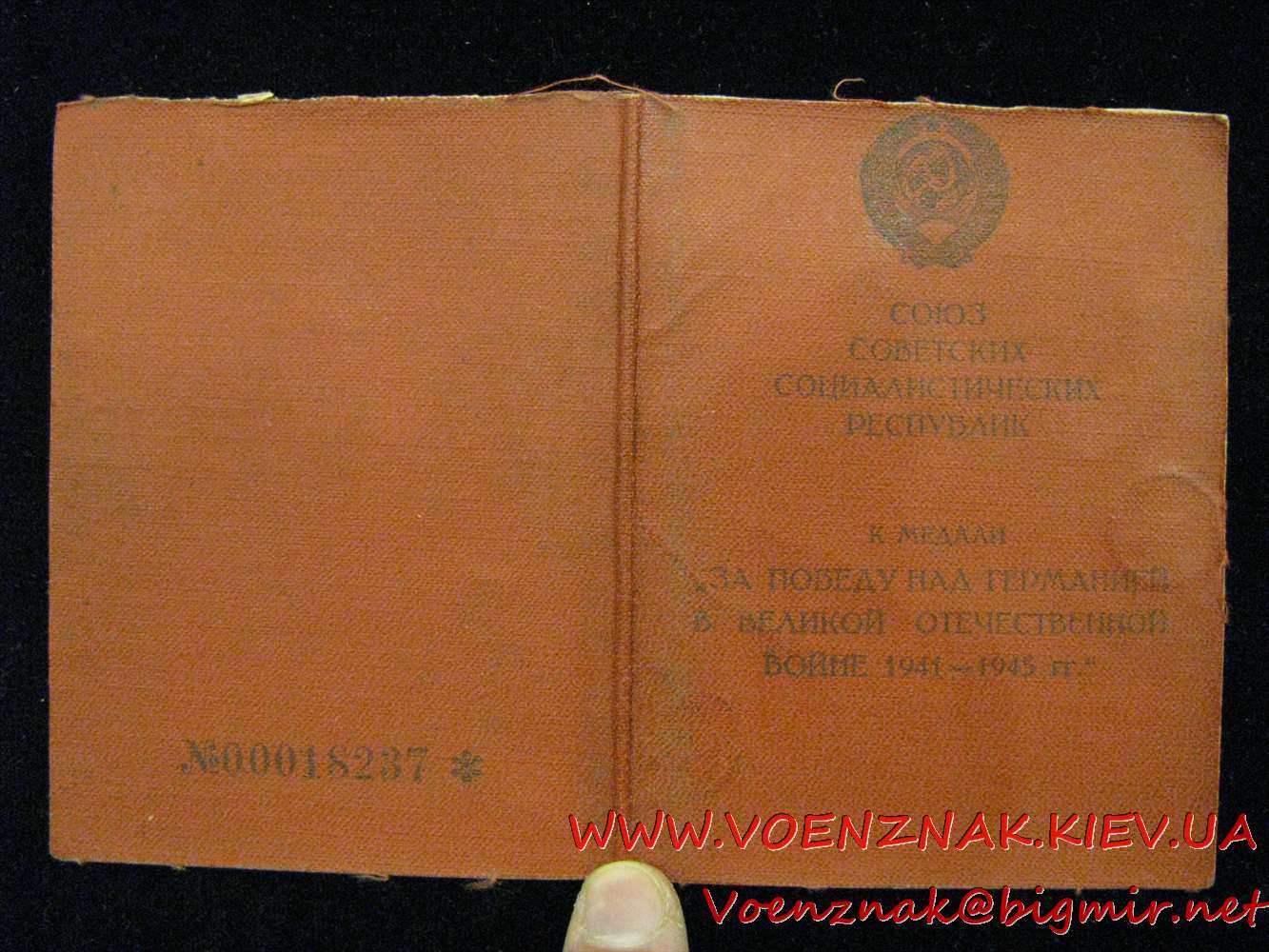 Удостоверение к медали "За победу над Германией в Великой Отечественной Войне 1941-1945 гг." в красном твердом переплете