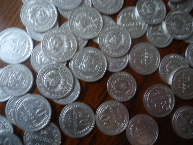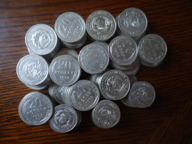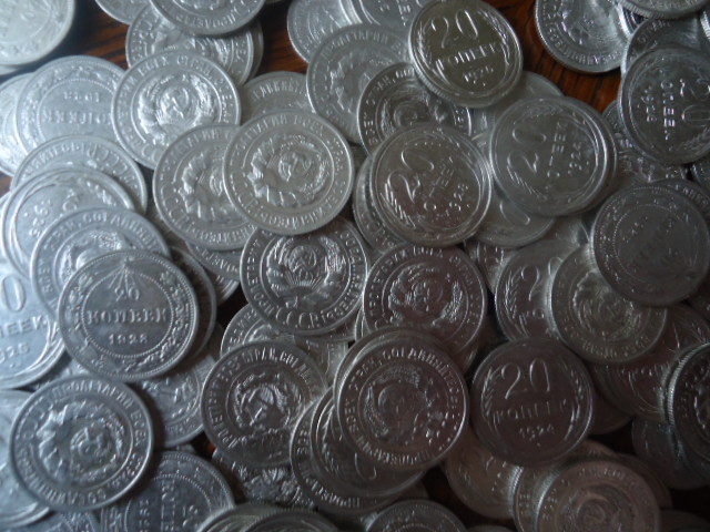 150 монет-120 по 20 копеек (1922-1925.1928-1929) и 30 монет 15 копеек 1923.Одним лотом по РФ
