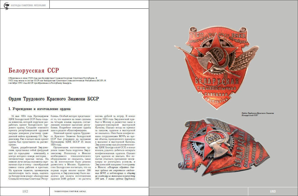 Книга богато иллюстрирована и хочется специально отметить, что многие награды, документы и фотографии публикуются в ней впервые. Также впервые дается расширенный список орденов, учитывающий все многообразие их вариантов и разновидностей; также включены и некоторые пробные знаки. Большой удачей стала возможность описать и сделать качественные фотографии единственного известного экземпляра пробного ордена Трудового Красного Знамени Украинской ССР образца 1925 года, а также пробного ордена Трудового Красного Знамени Закавказской ССР. Обнаружены и описаны в книге ранние варианты орденов Трудового Знамени Армянской ССР и Красной Звезды 3 ст. БНСР.