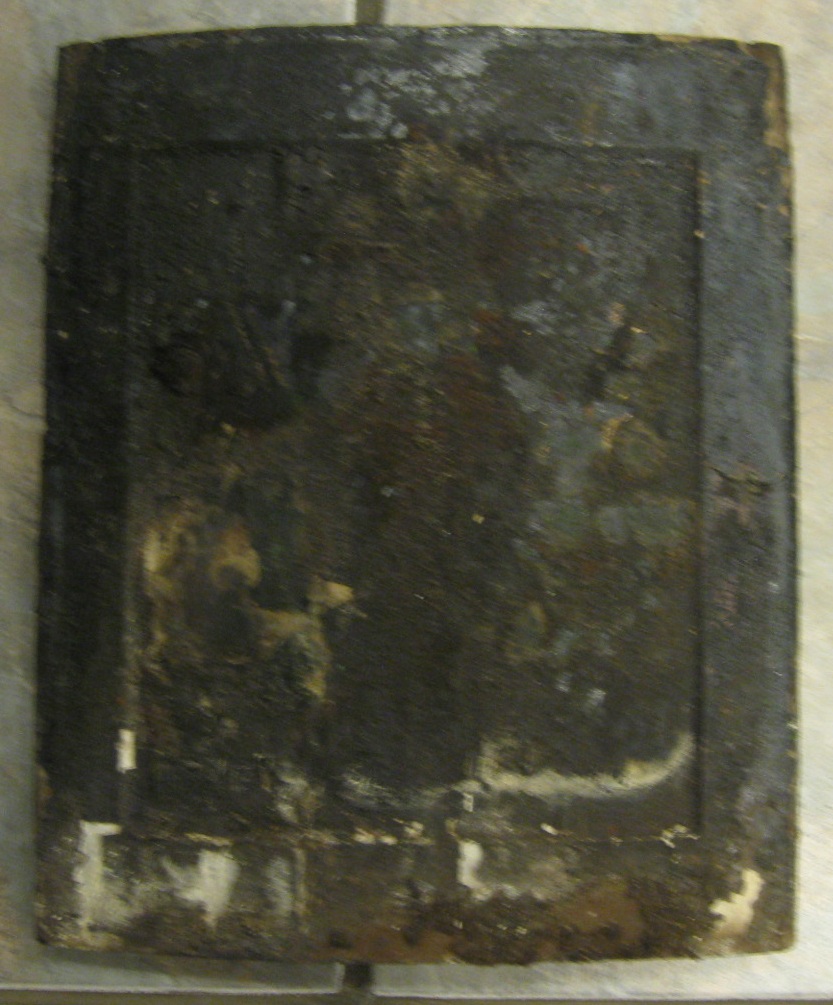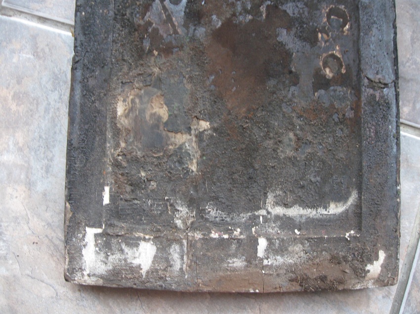 Икона вся темная,кое-где вспученная,но где-то просматриваются изображения.