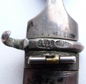 Кокошник влево - до 1908 года. Именник "АД" - ДАЛЬМАН АЛЕКСАНДР КАРЛОВИЧ. Фабрикант серебряных изделий в С-Петербурге. Всемирная Колумбова выставка в Чикаго, 1893 г.: серебро, черновые, эмалированные и филигранные изделия. Производство с 1880 г. ручное, в год на 200 т.р., 75 рабочих и 15 мальчиков. Материалы в С-Петербурге, сбыт в России и за границу. (33). 1881 г.: Дальман А. К., 24 года, учился у мастера Ф.Квятковского 5 лет, подмастерье с 1874 г. (подпись старосты серебр. цеха Егора Зубатова). Урок на мастера (февр. 1881 г.) присяжный мастер Ф. Квятковский, староста М. Филиппов; прож.: Б. Зеленина, 14 (43). 1892 г.: серебр. ремесло, Дельман А.К., П.С. Малый пр. ,36. (15). 1910 г.: мастерская серебр. изд. А. К. Дальман (кавказские изделия), Пороховская ул. 6. 1896 г.: Выставка в Н.-Новгороде, бронзовая медаль А.К Дальману. 1907 г.: 13 рабочих и 6 мальчиков, 25 т.р. (10).