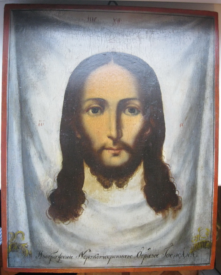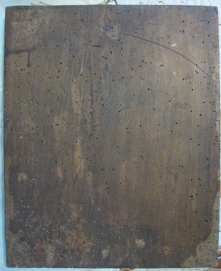Вот такая икона, размер 31,5 см на 25,5 см.Когда-то был прибит оклад, следы от гвоздей заделаны.Вроде больше реставраций нет.