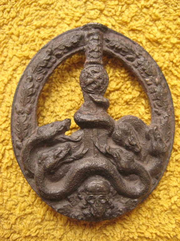 Антуражный знак реликтового происхождения. Булавка не открывается. Аккуратно чищен верхняя часть знака в частности рукоять меча и свастика тонированны под бронзу оригинальное покрытие на венке змеях черепе и лезвии меча.