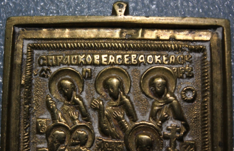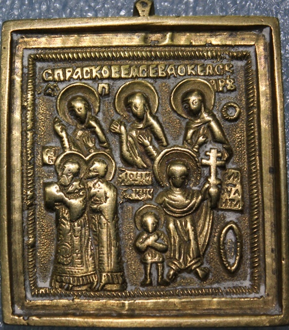 Иконка размером 5 х 5,5 см В верхнем ряду св.Параскева Пятница, св.Варвара и св.Евдокия.Вроде по канонам в середине должна быть Екатерина, а здесь написано Евдокия.Если я не прав, поправьте.