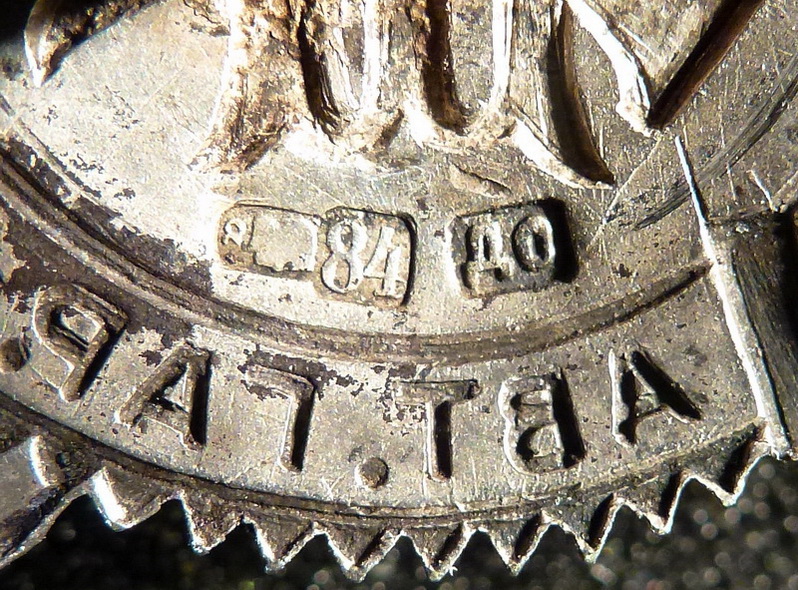 Серебро, золочение герба, эмали.