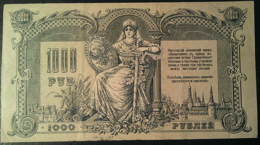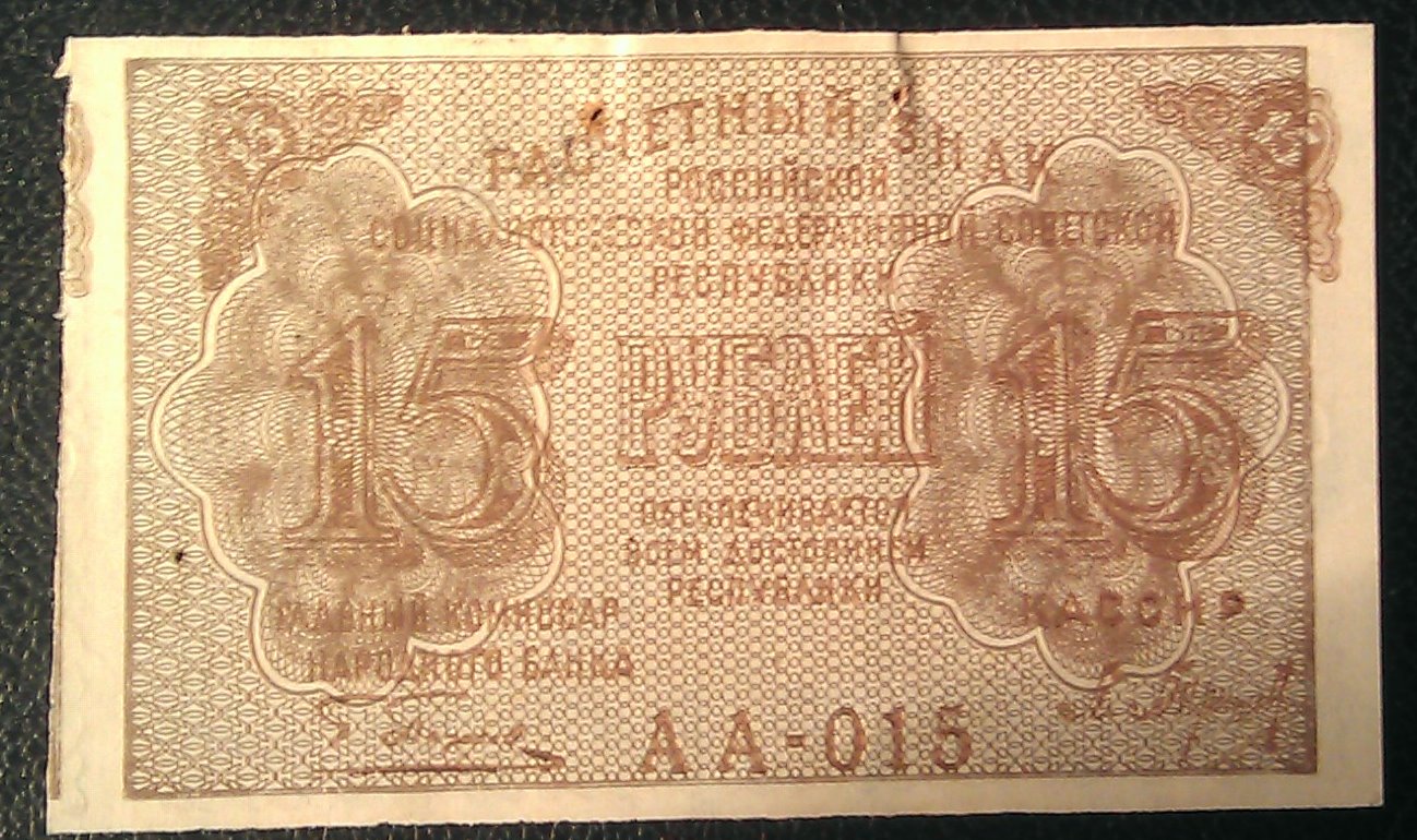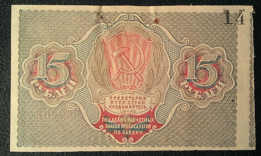 6 - 15р 1919 центр. VF+ - Брак - сдвиг основного рисунка с одной стороны, и брак обреза с другой стороны.Плюс какой-то номер 14. Скорее всего была подколота к делу куда-то как брак. МПЦ - 8.000
