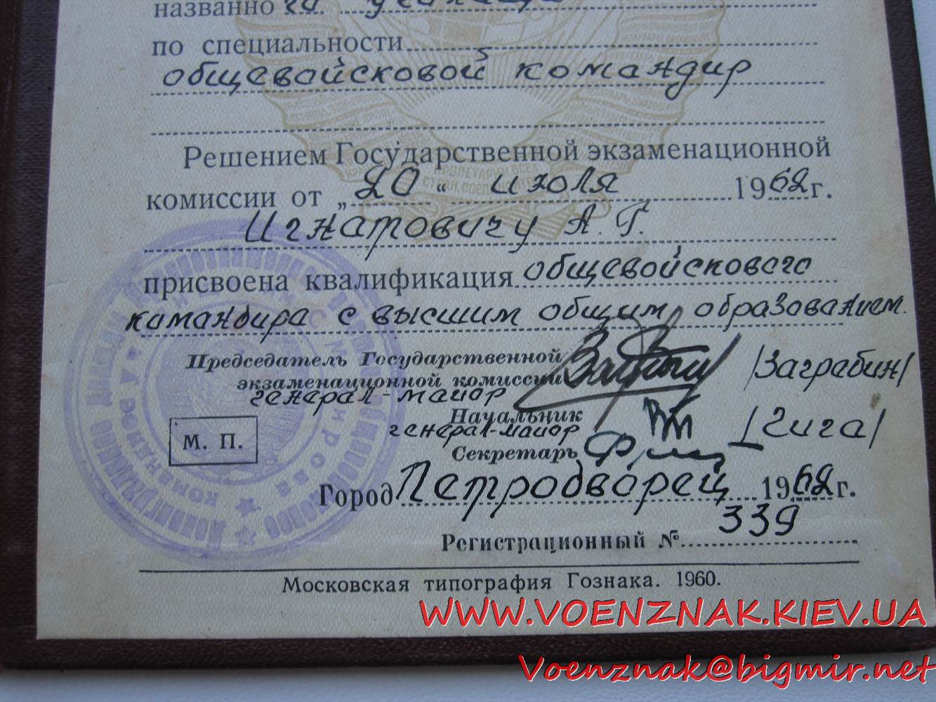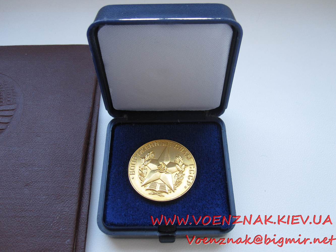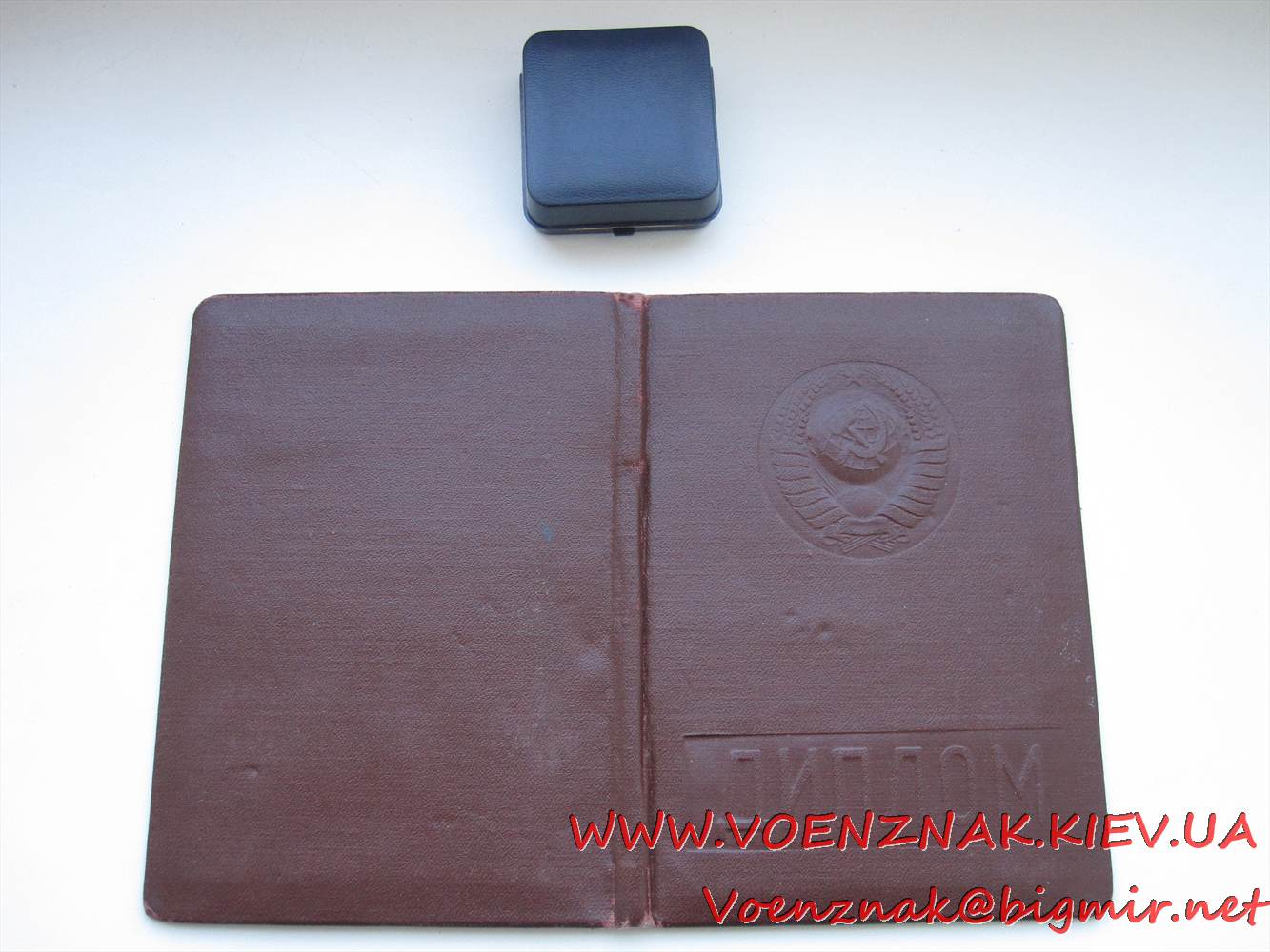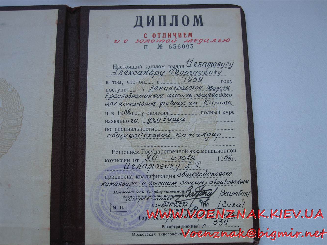 Диплом об окончании Ленинградского Краснознаменного высшего общевойскового командного училища им. Кирова училища с отличием, + золотая медаль в коробке