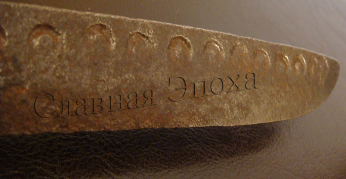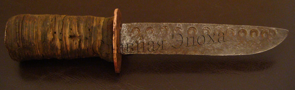 Ручка из слоев бересты. На лезвии круги солнца.