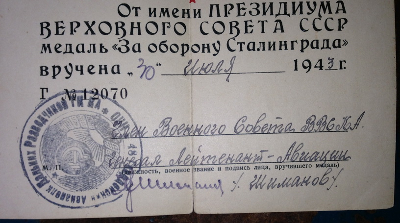 На времянке за Сталинград подпись члена Военного Совета ВВС Красной Армии генерал-полковника авиации Шиманова репрессированного по знаменитому Авиационному делу.