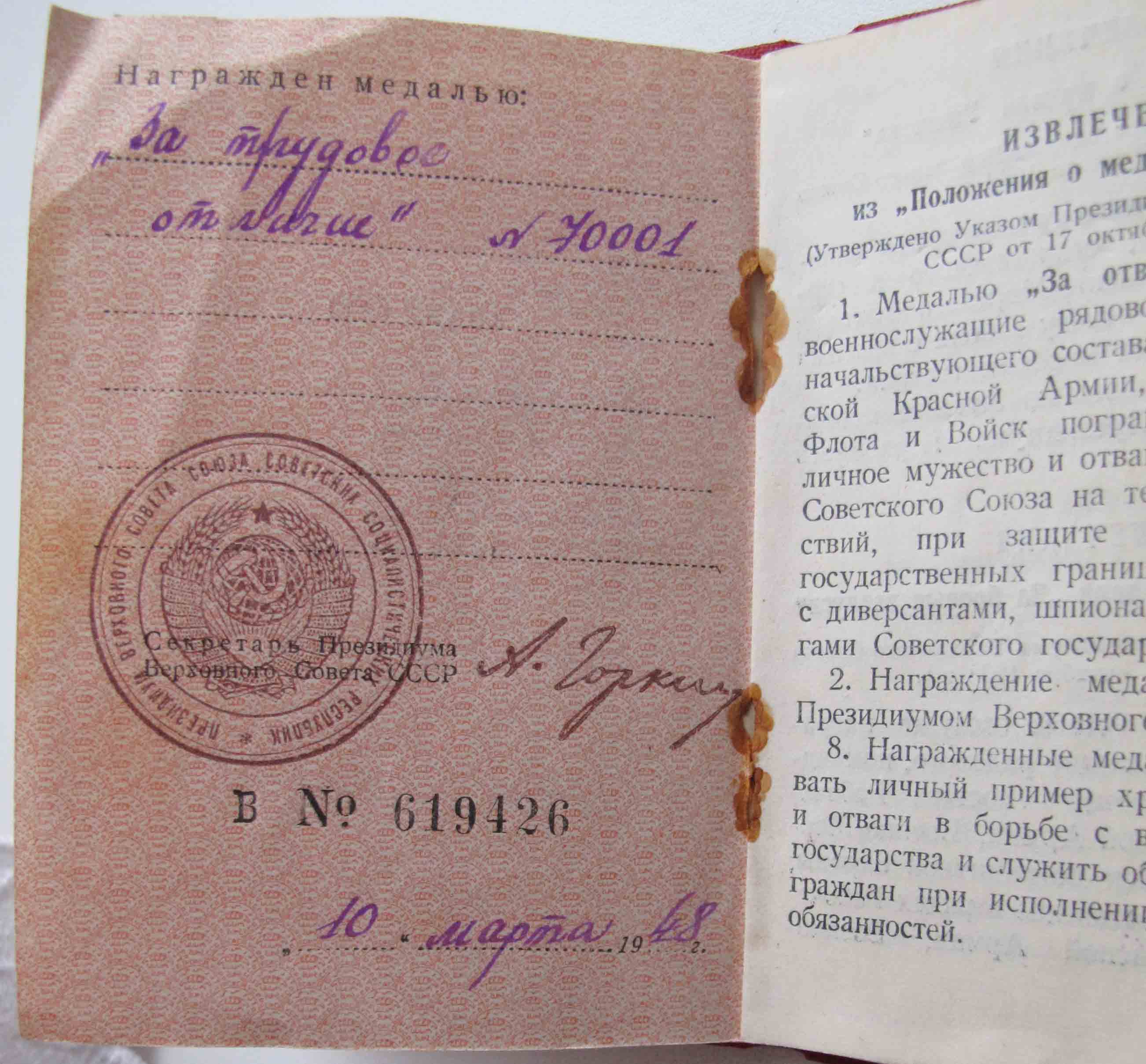 Медали Серп и Молот, За Трудовую Доблесть, За Трудовое Отличие, За Доблестный Труд в Великой Отечественной Войне,За Восстановление Предприятий Чёрной Металлургии Юга, За Восстановление Угольных Шахт Донбасса, За Освоение Целинных Земель, За Строительство БАМ, За Преобразование Нечерноземья РСФСР, За Освоение Недр и Развитие Нефтегазового Комплекса Западной Сибири, Ветеран Труда