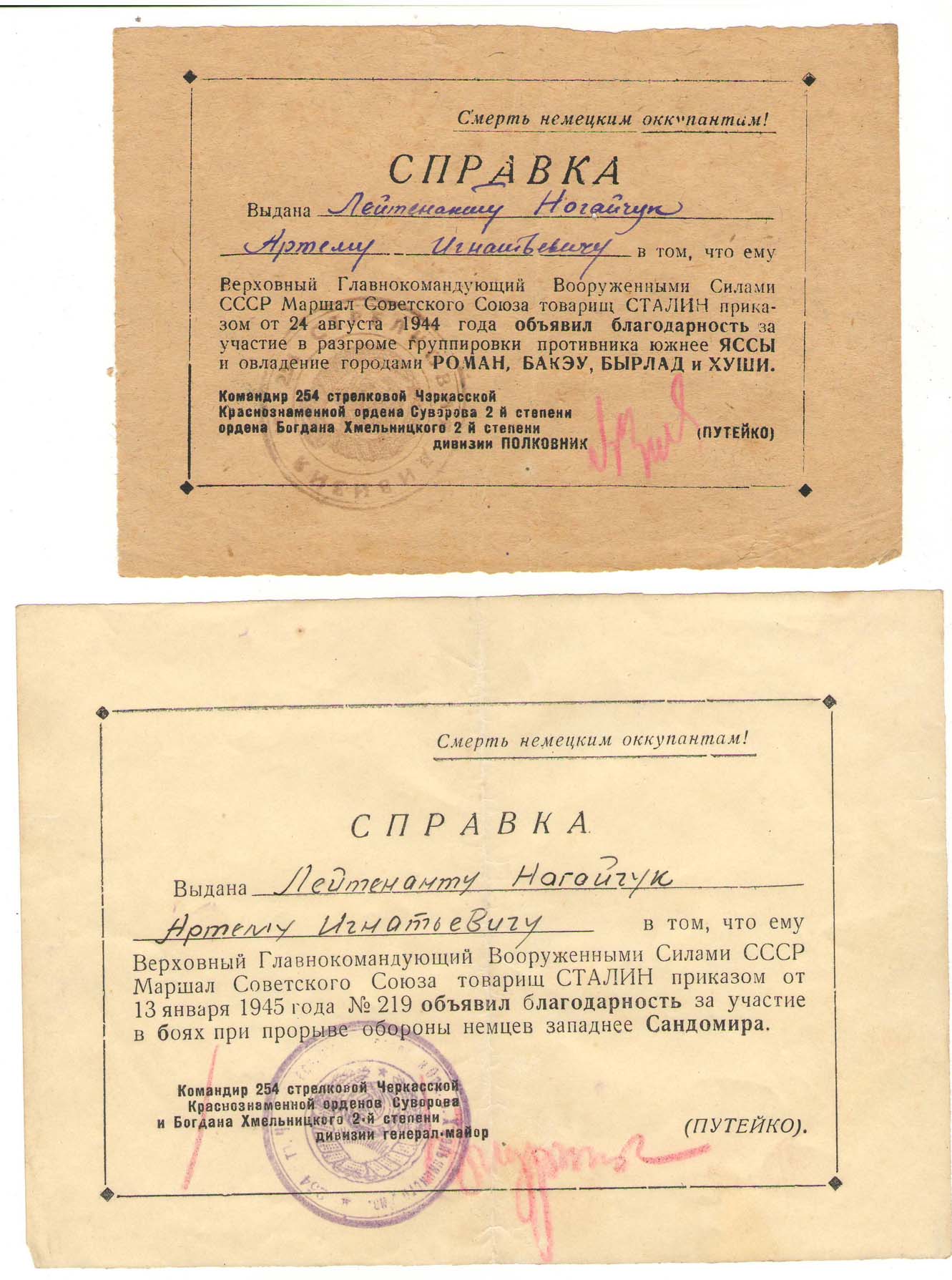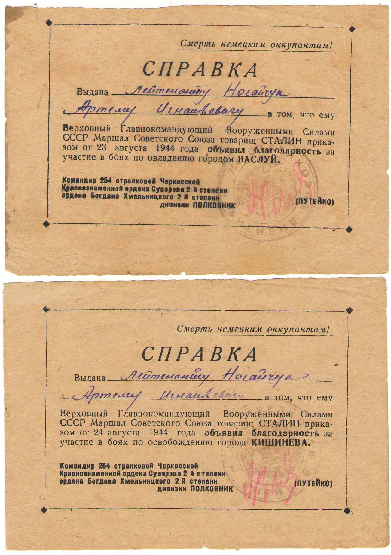 Почистил запасы и нашёл вот такой набор справок. Можно отследить более чем интересный путь кавалера.