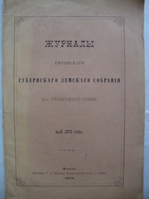 Журналы Рязанского Губернского земского собрания. VI чрезвычайного созыва. Май 1878г. «Печатано с разрешения Г.и.д. Рязанского Губернатора». Изд-во: Типография В.В. Давыдова