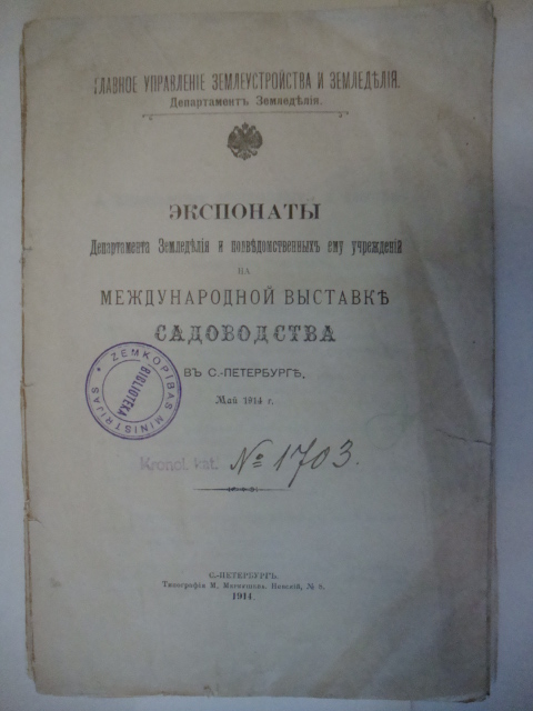Экспонаты «Департамента Земледелия и подведомственных ему учреждений» на международной выставке садоводства в С-Петербурге. Май 1914г. Типография М.Меркушева. Главное управление землеустройства и земледелия.