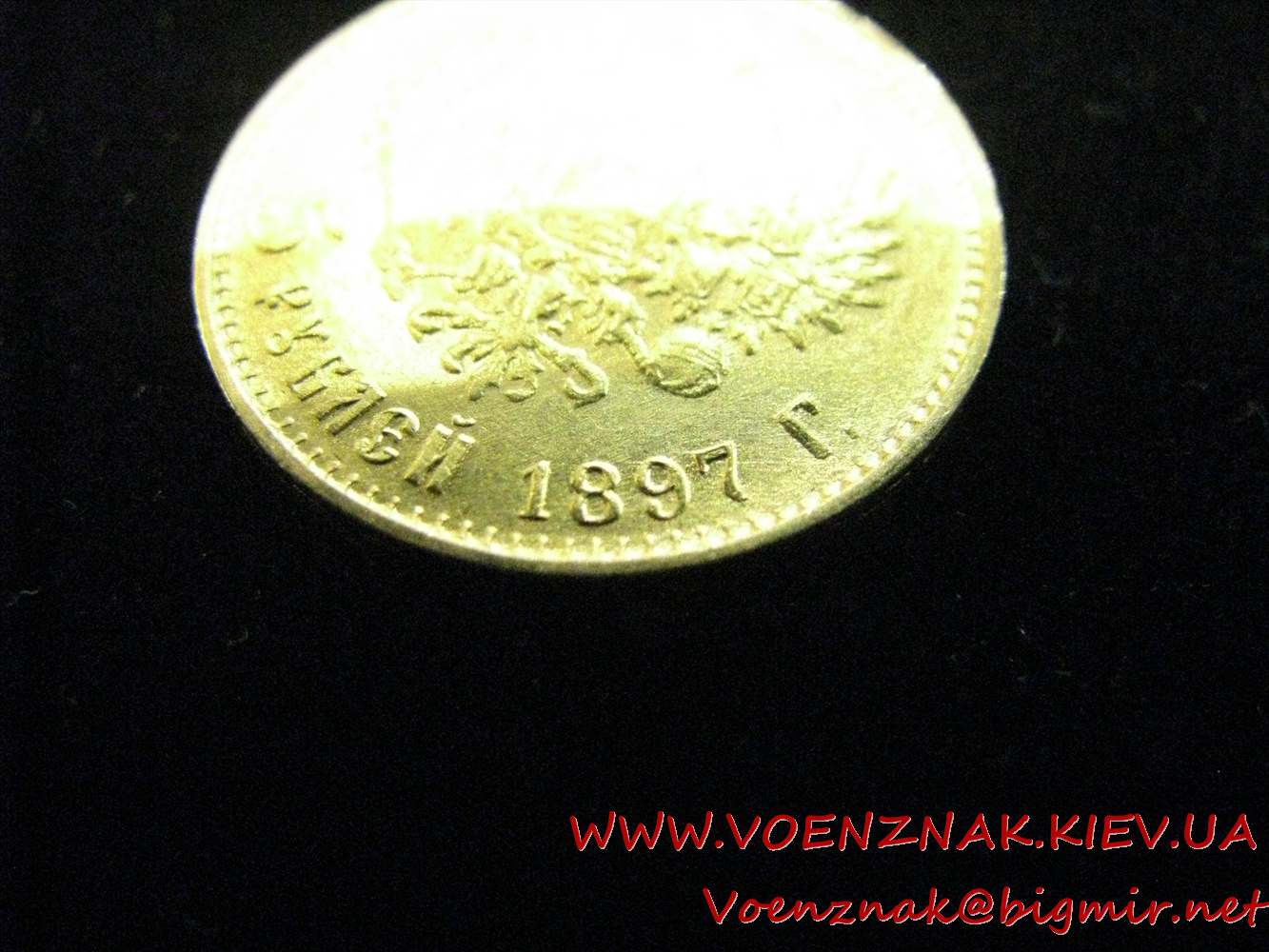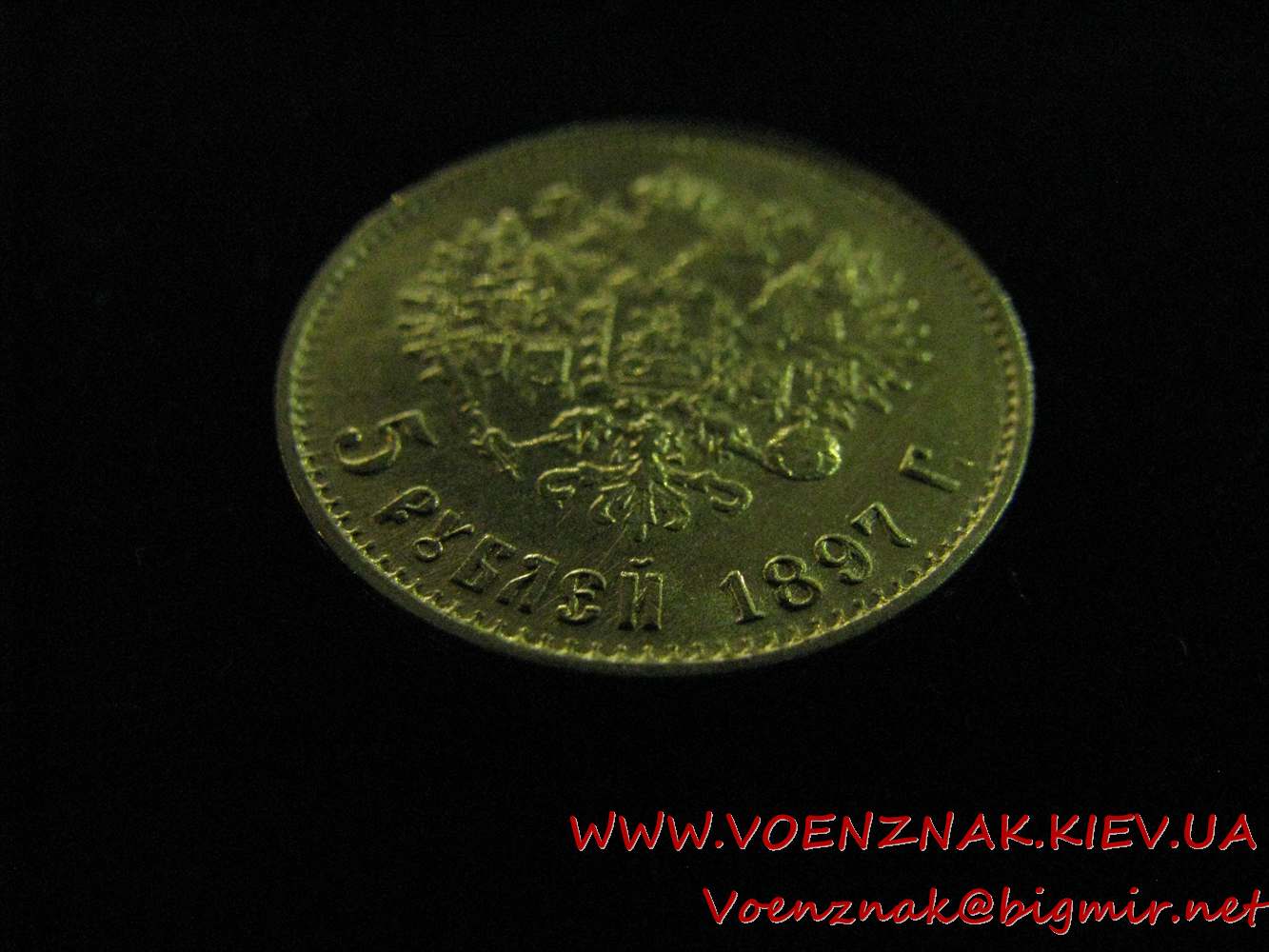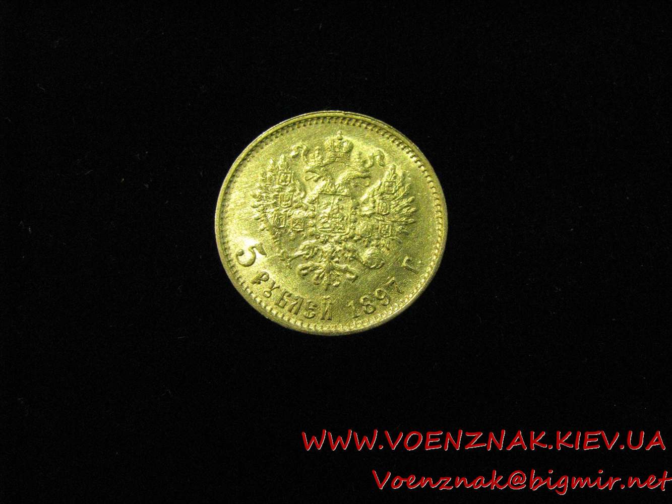 Царская золотая монета достоинством 5 рублей с изображением Императора Николая II на аверсе, 1897 год, аббревиатура "АР" в чеканке