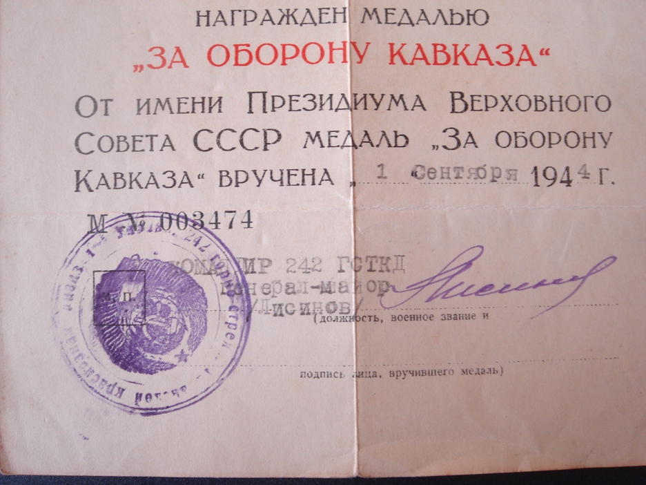 Всё на фото, в орденской выпадает страничка, у звезды битый луч на 7 часов, по Украине. Удостоверение "За оборону Кавказа", подписано командиром 242 ГСТКД генерал-майором Лисиновым.