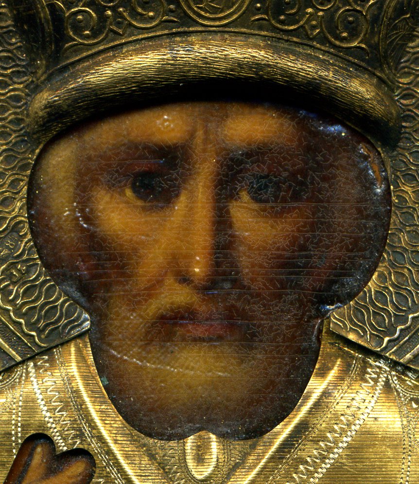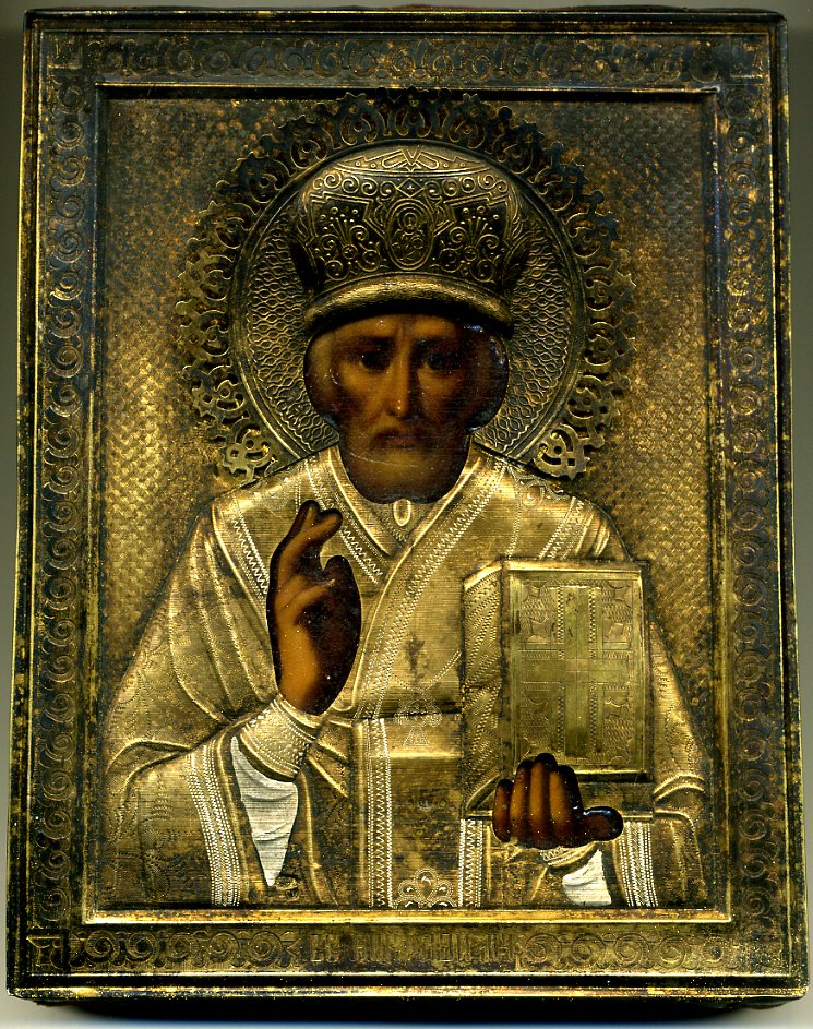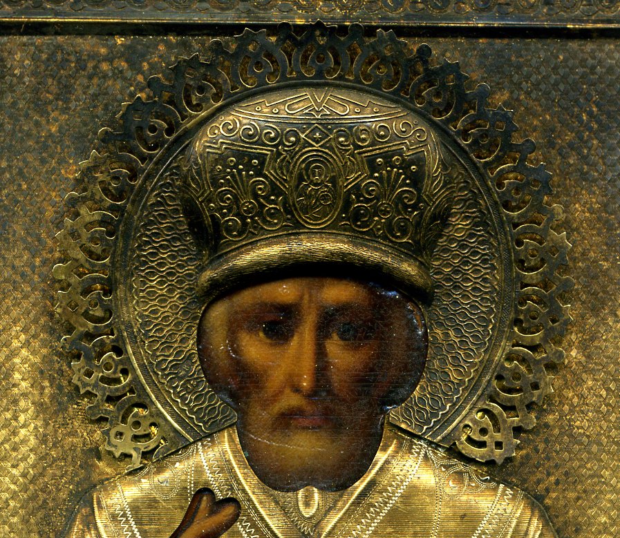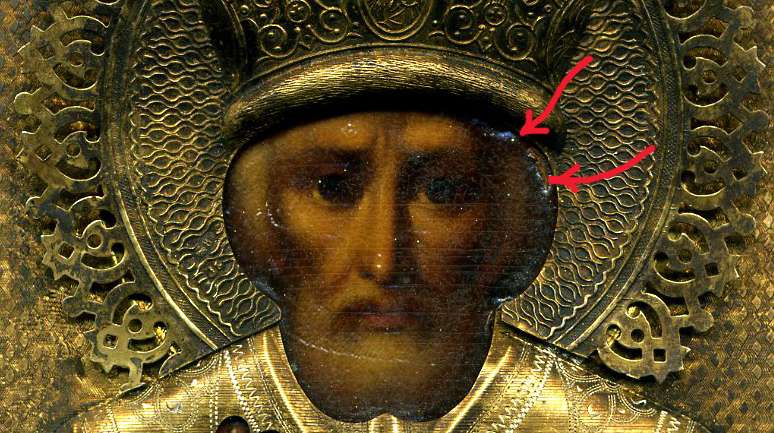 Оклад в отличном состоянии с густой позолотой без вмятин, царапин и разрывов с иконы не снимался, гвозди родные.