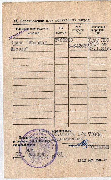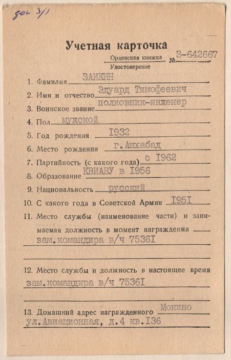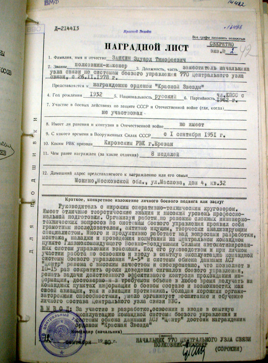 Предлагаю к продаже орден красной звезды за № 3760903. Орден без ОК. Награжденный – полковник–инженер Заикин Эдуард Тимофеевич, выпускник КВИАВУ ( Киевское высшее инженерно – авиационное военное училище Военно – Воздушных Сил ). Работал на оборонку страны. Орден получен за разработку, освоение и внедрение в эксплуатацию командной системы боевого управления «А-5» и системы обмена данными СОД «Центр».